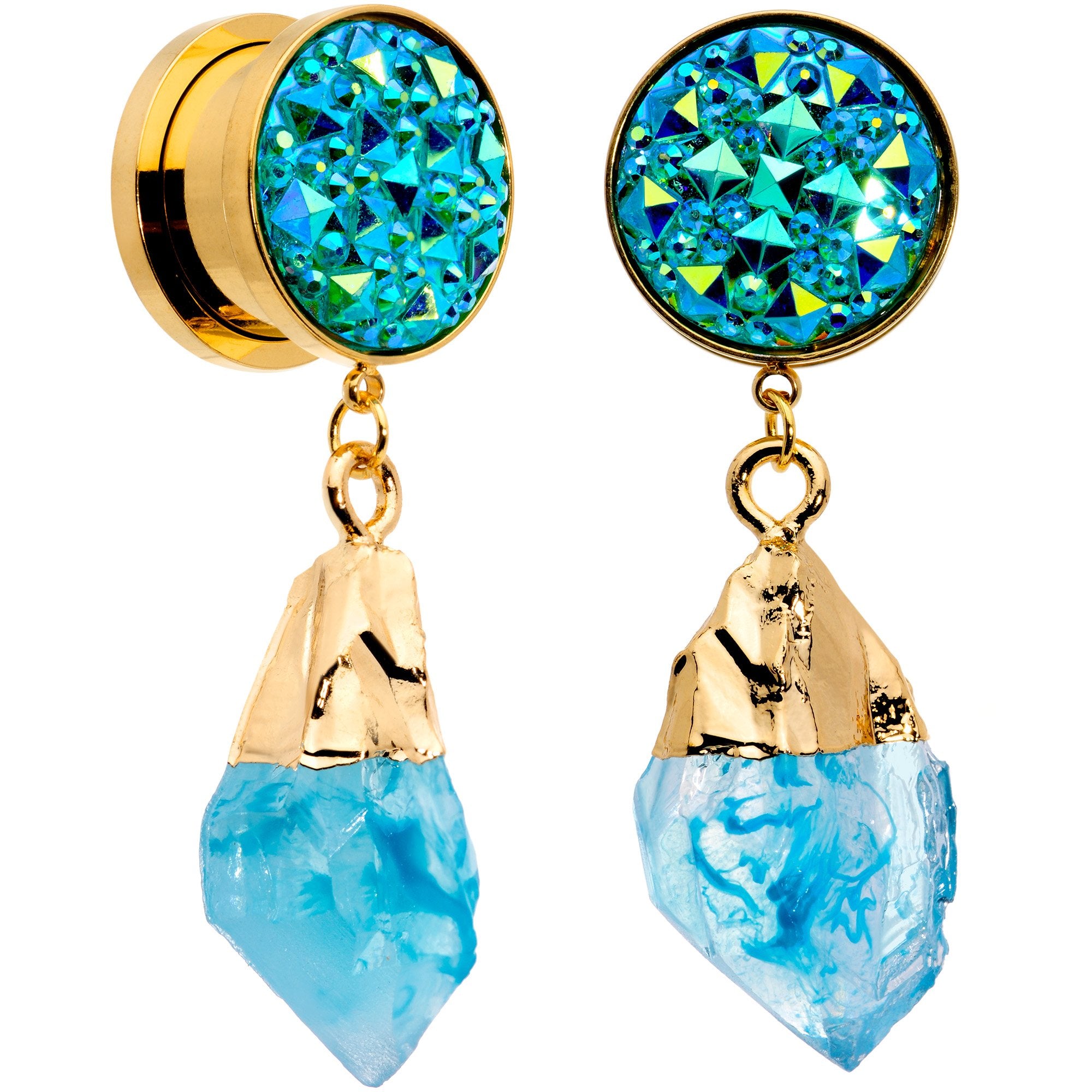 Gazing at the many shades of blue contained in this pair of dangle plugs will make you feel like you've magically gone to the beach! Made with gold tone anodized over 316L surgical grade stainless steel, these ear gauges feature faceted blue inlays as well as a teal faux druzy quartz dangles and have a screw fit design for secure wear. Sold as a set of two.