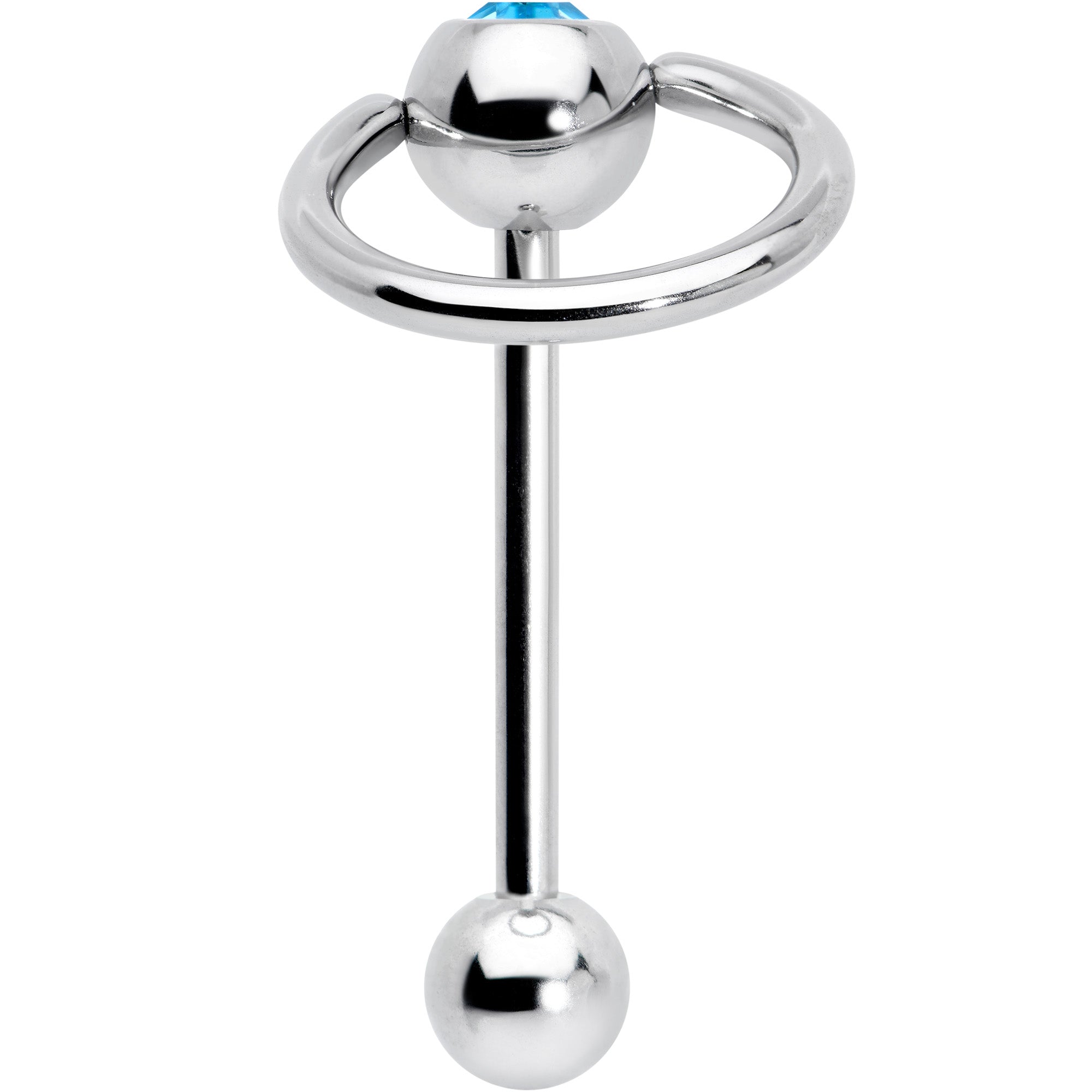 Hold the world captive with this 14 gauge tongue jewelry. It is made with a 5/8 inch 316L surgical grade stainless steel straight barbell with a 5mm bottom ball end. The top end features a 5mm ball end, set with a blue gem. It also features an attached captive ring, for a truly vibrant combination of captive bead ring and straight barbell. This tongue piercing ring is clearly the best and most stylish of both worlds.