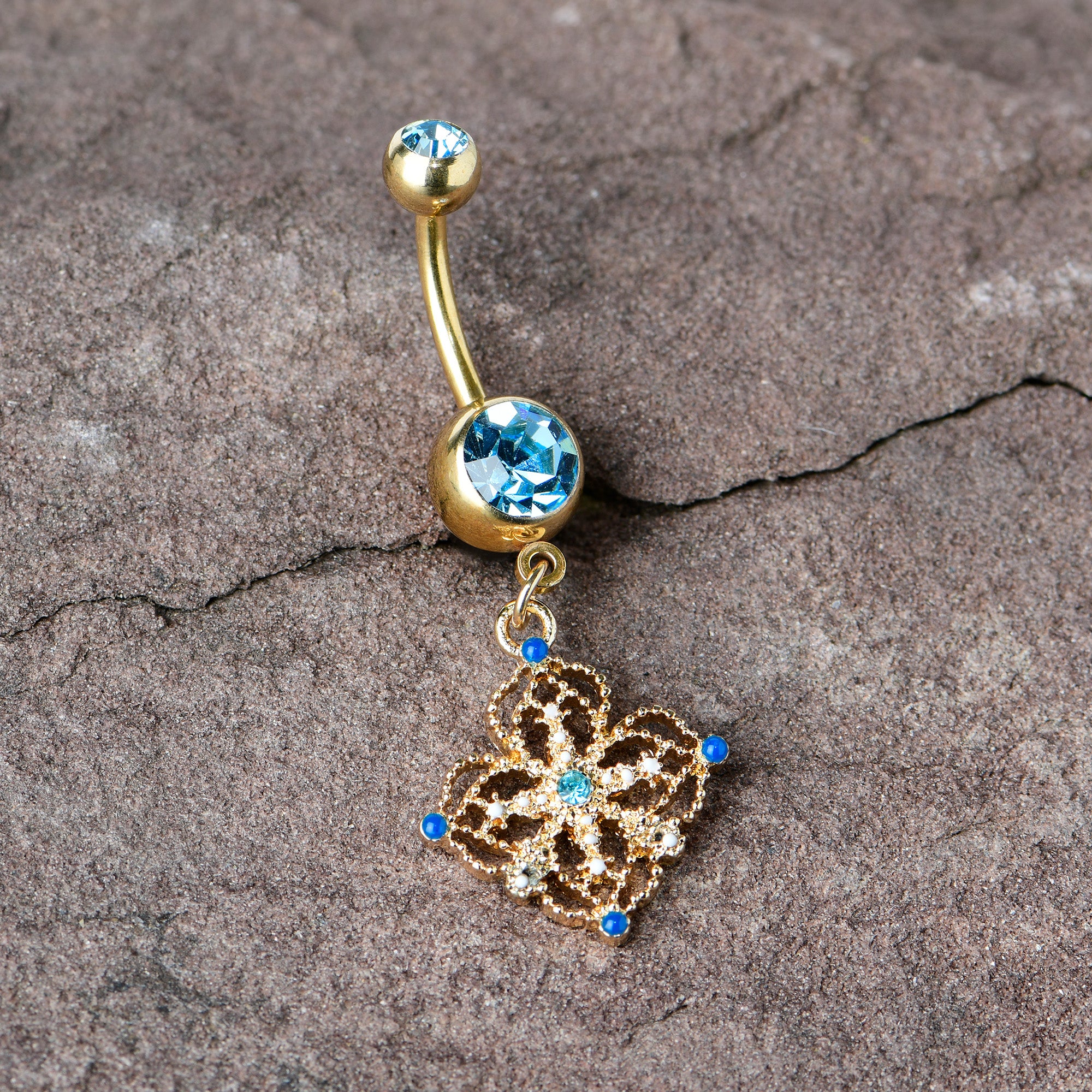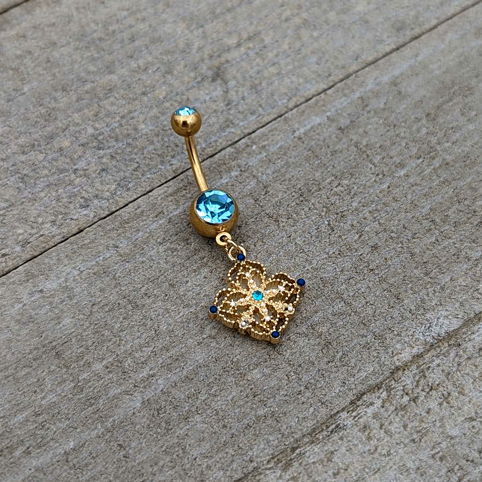 Blue Gem Gold Tone Texture Emblem Dangle Belly Ring
