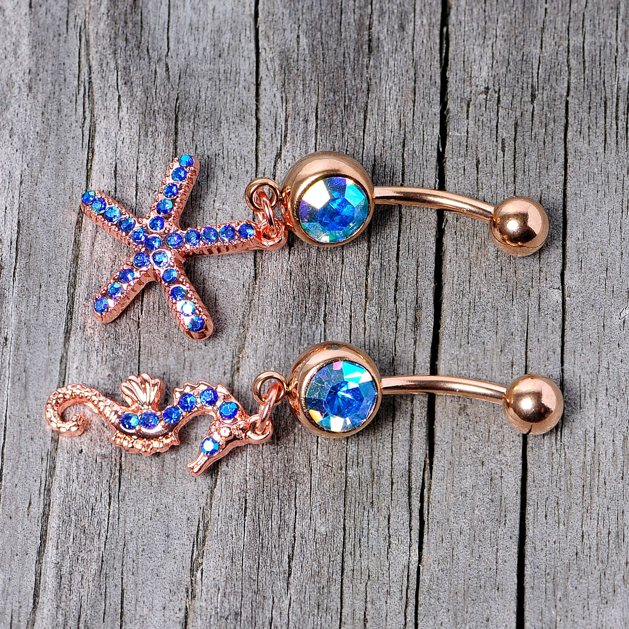 Blue Gem Rose Gold Tone Starfish Seahorse Nautical Belly Ring Set of 2
