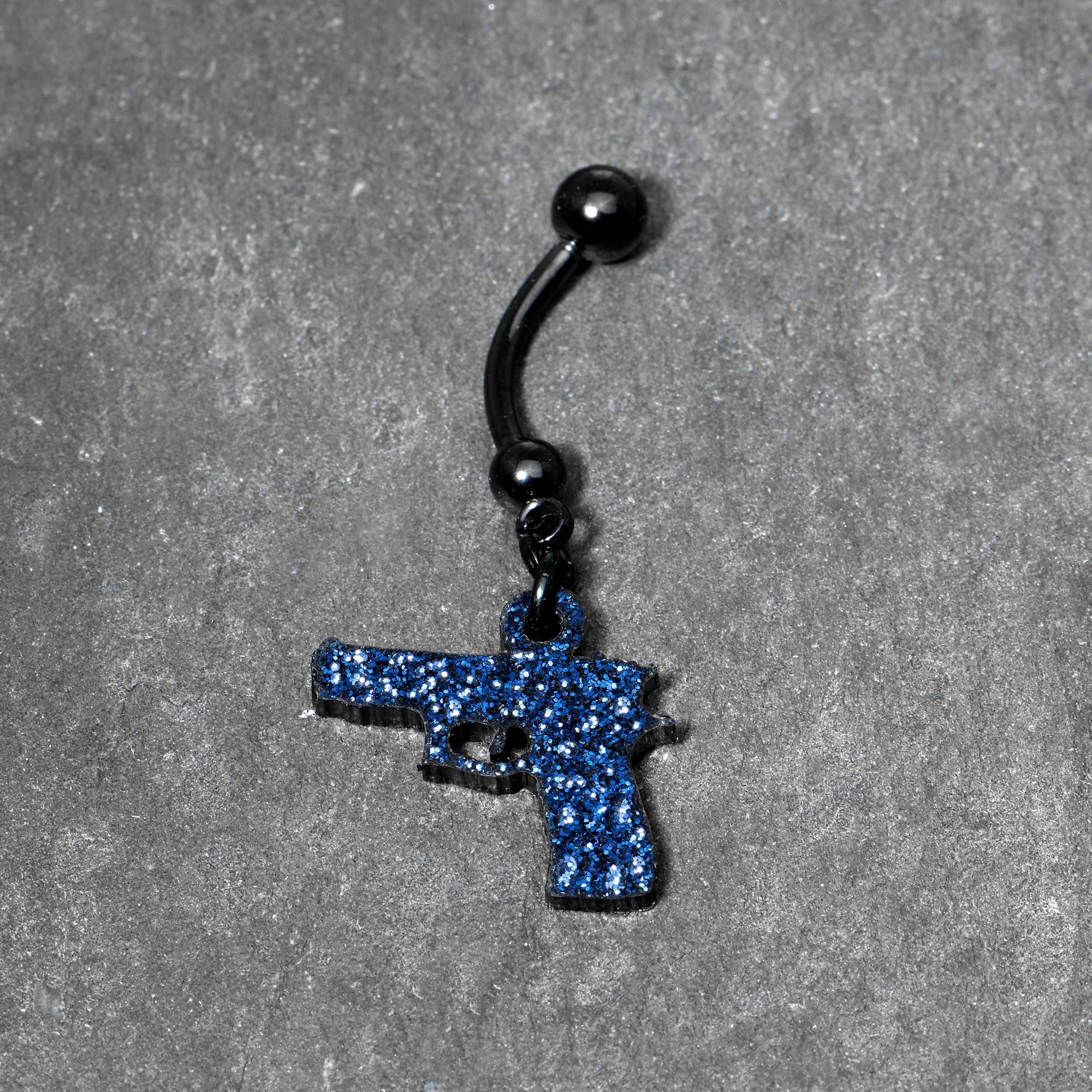 This 14 gauge navel ring is made with a 7/16" black PVD over 316L surgical grade stainless steel curved barbell with a 5mm top ball end. Dangling from the bottom ball end is a blue gun charm, paved with glitter. This belly piercing jewelry is sure to get attention.