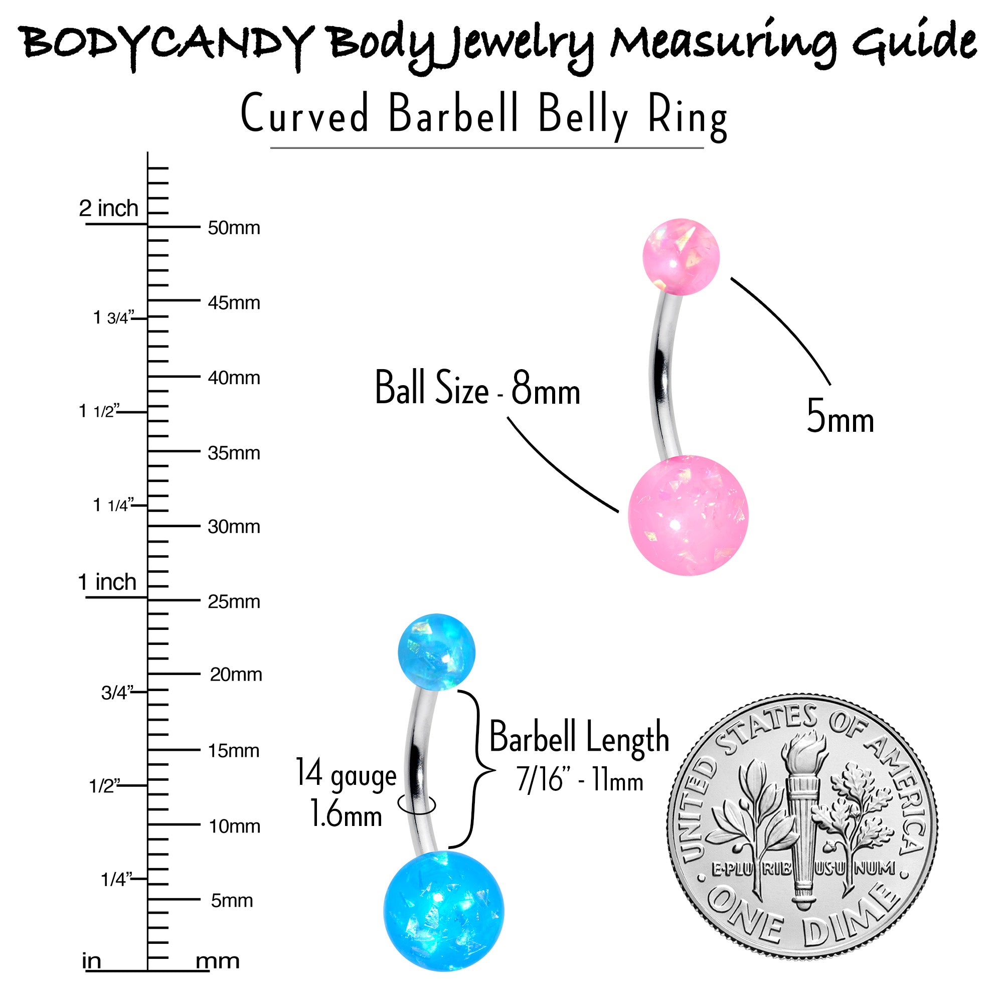 Simple colors can be simply stunning with these 14 gauge navel rings. They are made with 3/8 inch durable 316L surgical grade stainless steel curved barbell with 5mm top ball ends and 8mm bottom ball ends. The ball ends are faux opal and feature intense colors for a look that turns basic to beautiful. You get one each in pink, light blue, dark blue, and purple. Keep it basic without looking boring with these charming belly piercing rings. Sold as a set of four.