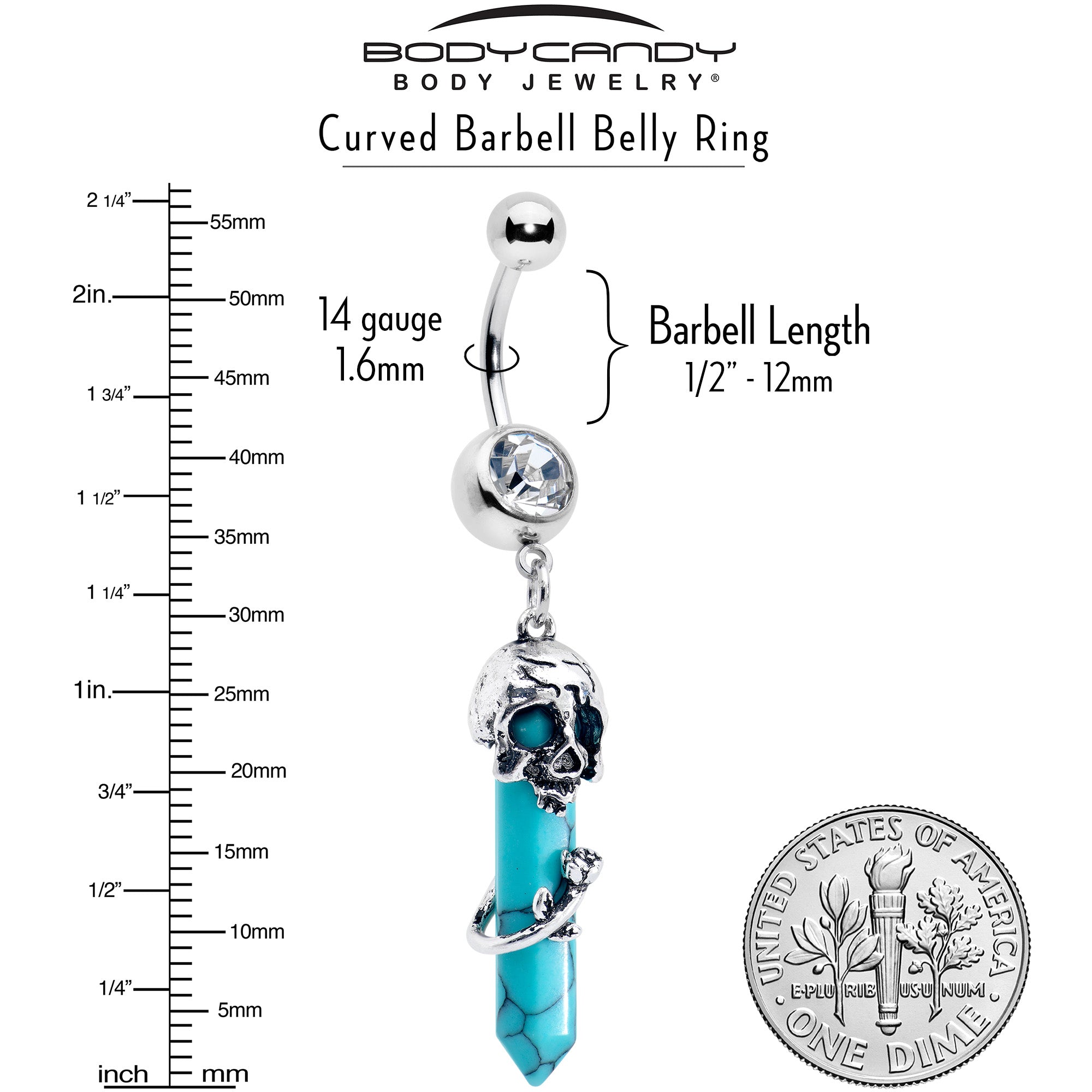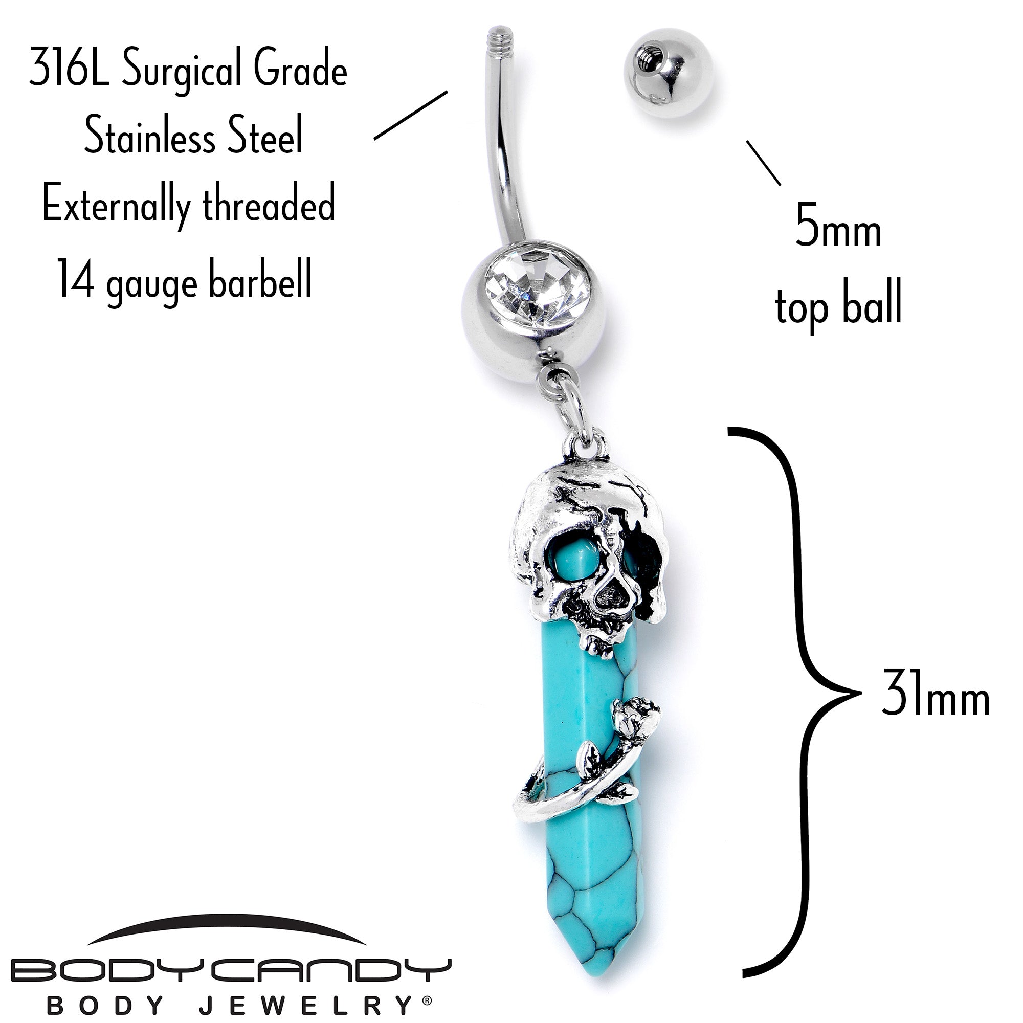 If you're into rock and roll or jam bands, this 14 gauge navel ring is sure to give you a happier aura. It's made with a 3/8 inch 316L surgical grade stainless steel curved barbell with a 5mm top ball end. The bottom ball end is 8mm and set with a large clear gem. Dangling beneath it is a large blue turquoise stone that would be so popular among the hippies of the '60s, with its classic obelisk shape. It is topped with a skull embellishment and has a rose embellishment wrapped around it. While we can't claim it has any magical powers, it will certainly look magical in your belly button piercing.