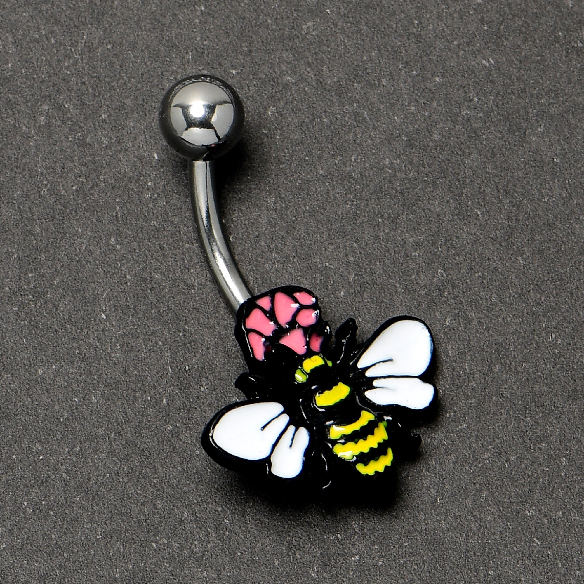 Catch a buzz of bee-utiful style with this 14 gauge navel ring. It is made with a 3/8 inch 316L surgical grade stainless steel curved barbell with a 5mm top ball end. The bottom end features a gorgeous bee charm, with white wings and traditional yellow and black stripes. The bee is busily pollinating a pink flower with matching black detail. You will bee the hottest honey in the hive with this fabulous flower and bee belly piercing ring.