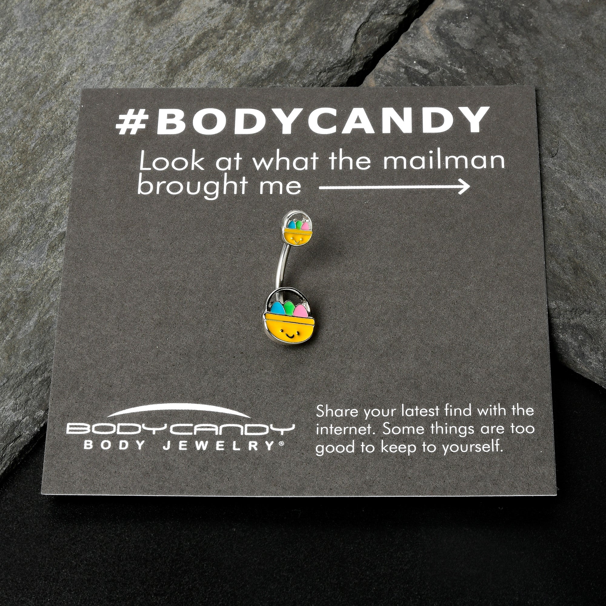 Put all your eggs in one basket with style when you're rocking this 14 gauge navel ring! It's made with a 3/8" durable 316L surgical grade stainless steel curved barbell. Each of the ends features a yellow Easter basket charm, with a cheery smiling face. The baskets each contain Easter eggs in pink, green, and blue, for an added touch of festive color. You'll be hopping down the bunny trail in kawaii style with these Easter themed belly piercing rings!