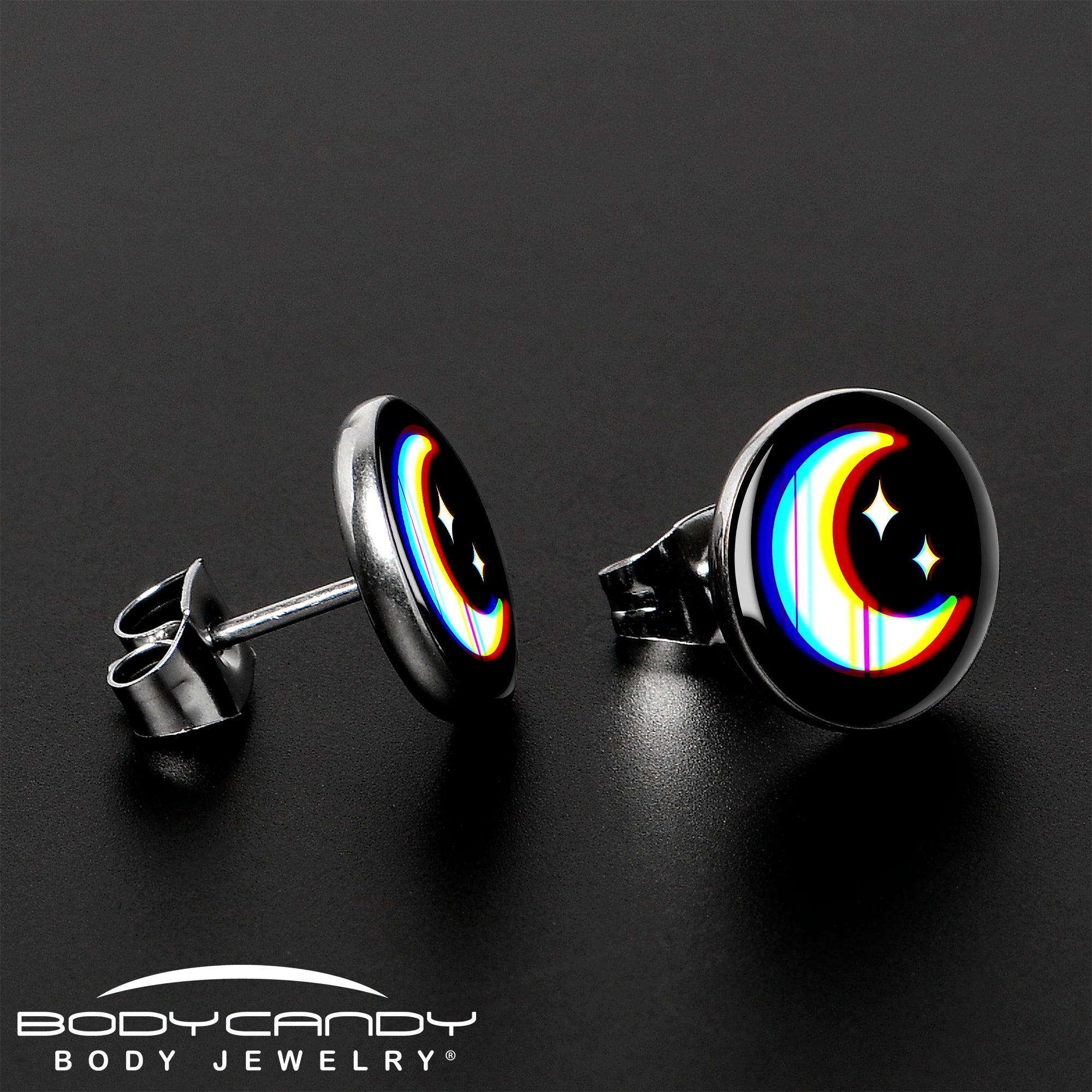 This vibrant moon is wearing peaceful colors on these stud earrings for pierced ears. They're made with stainless steel straight posts with friction backs for a secure fit. Each one features a chromatic crescent moon charm on a black background, with a pair of matching stars set in the moon's curve. Show the world you love all the colors of the night with these lovely, lunar earrings. Sold as a set of two.
