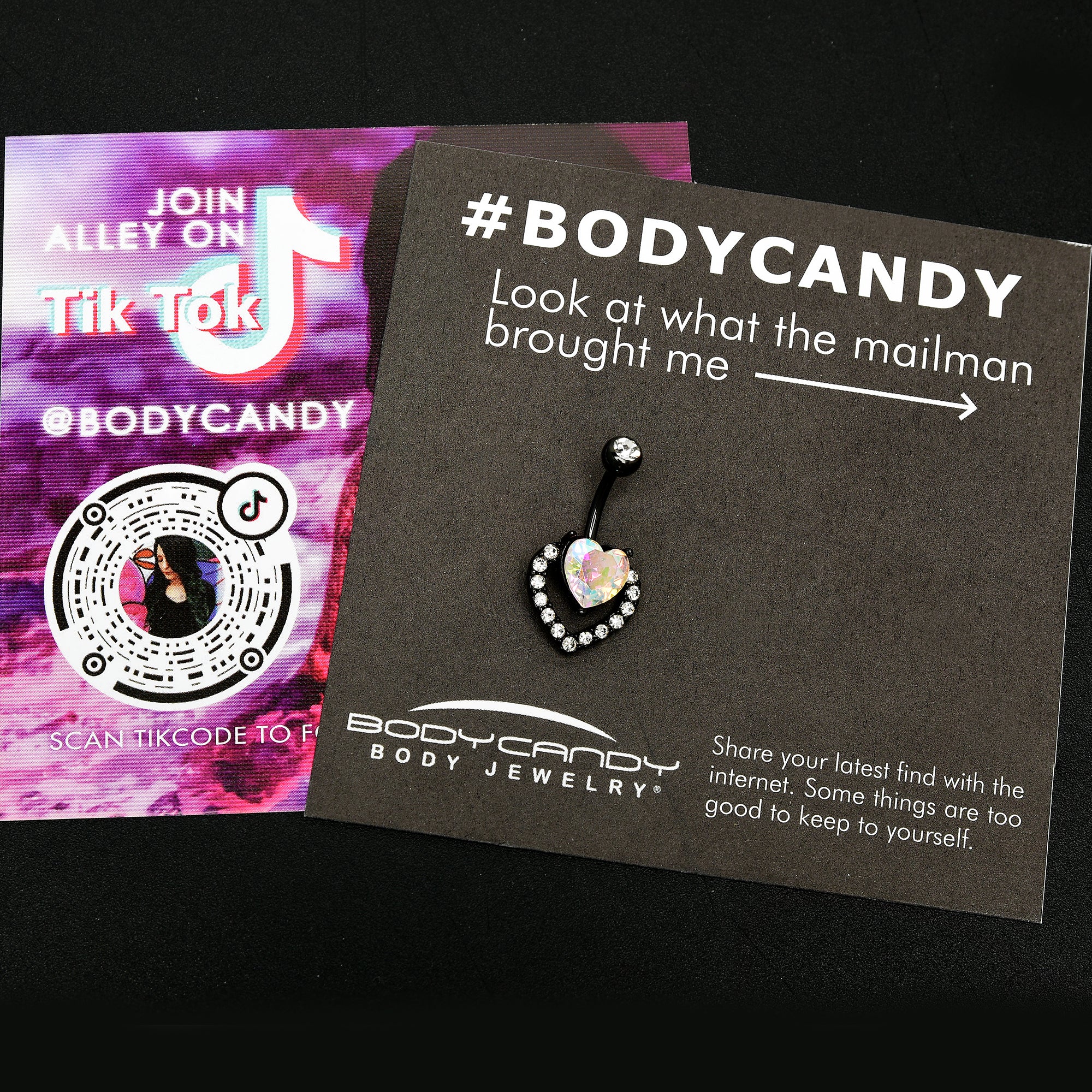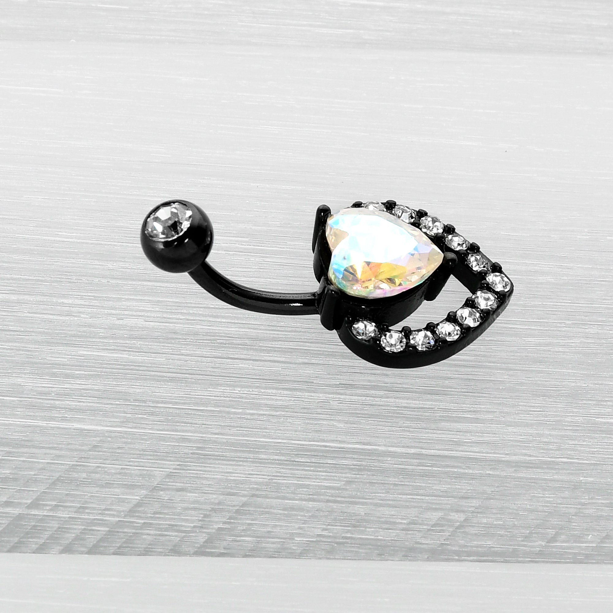 Look luxe and love it without breaking the bank with this 14 gauge navel ring! It's made with a 3/8" black PVD over 316L surgical grade stainless steel curved barbell. The top ball end is 5mm and set with a clear gem. The bottom end features a heart charm, paved with clear gems and set with a heart-shaped aurora gem at the top. You're going to fall in love with the opulent look of this heart-themed belly piercing ring!