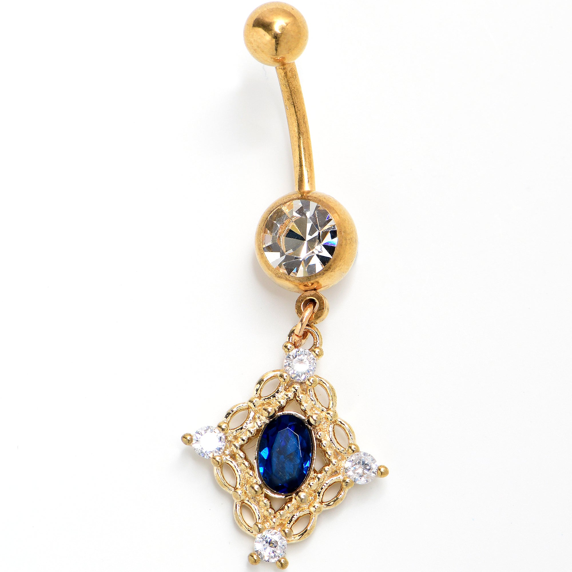 You will feel like royalty when you are rocking this 14 gauge navel ring. It is made with a 3/8 inch gold tone PVD over 316L surgical grade stainless steel curved barbell with a 5mm top ball end. The bottom ball end is 8mm and set with a clear gem. Dangling beneath is an elegant rhombus charm, with clear gems set in each of the points. The rhombus is set with a blue gem at the center for a color contrast you can not take your eyes off of. Look as regal as you feel with this elegant rhombus belly piercing jewelry.