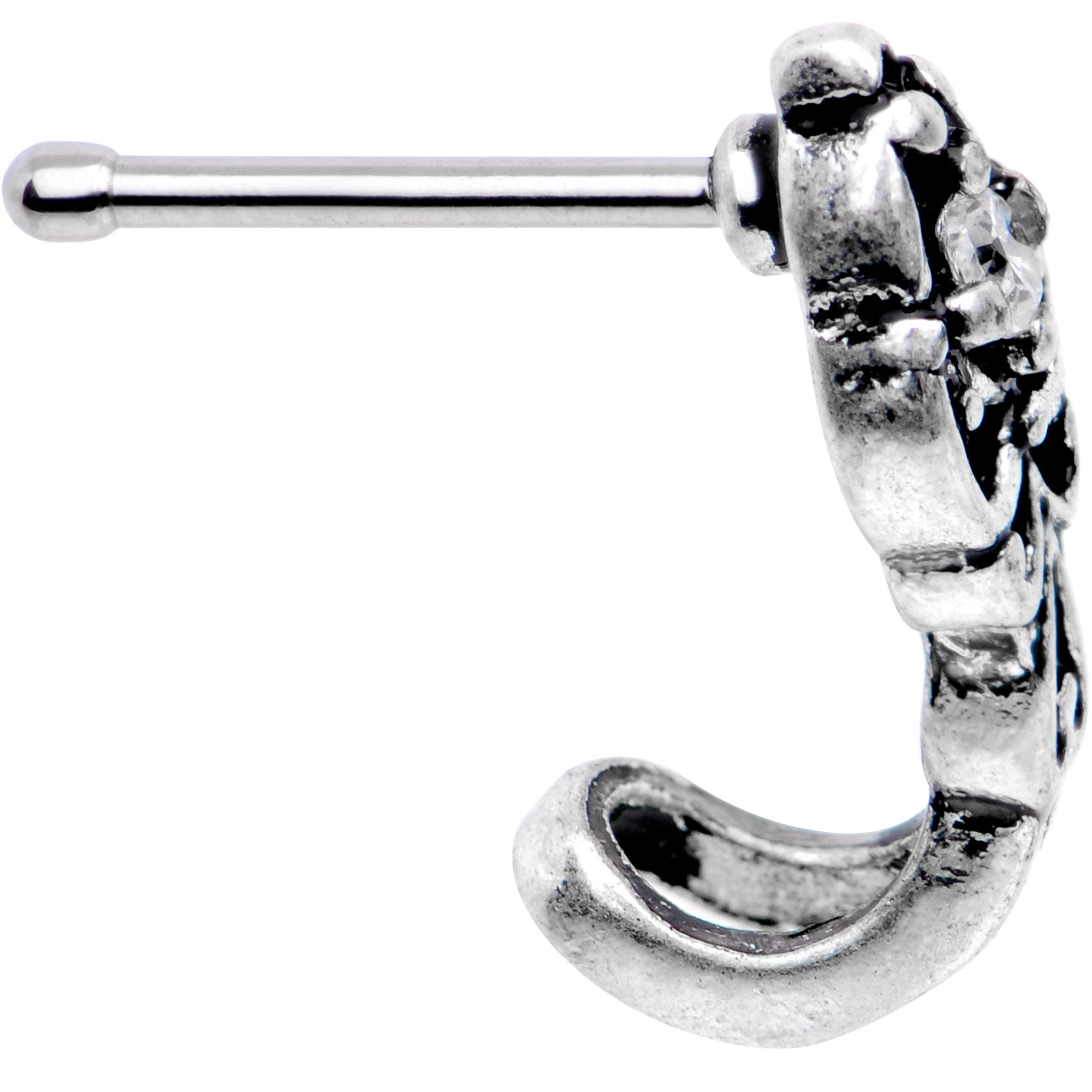 Embrace a lovely look for your nose piercing when you wear this nose ring that looks like a hoop! Made with a 1/4" length durable 316L surgical grade stainless steel post, this nostril piercing features a fashion twist charm set with a clear cubic zirconia gem on a half hoop that wraps around the nose and sits outside of your nostril to give the illusion of a hoop in your regular (pierced!) piercing without actually wearing one at all. Try something new; this interesting nose jewelry may be right for you!