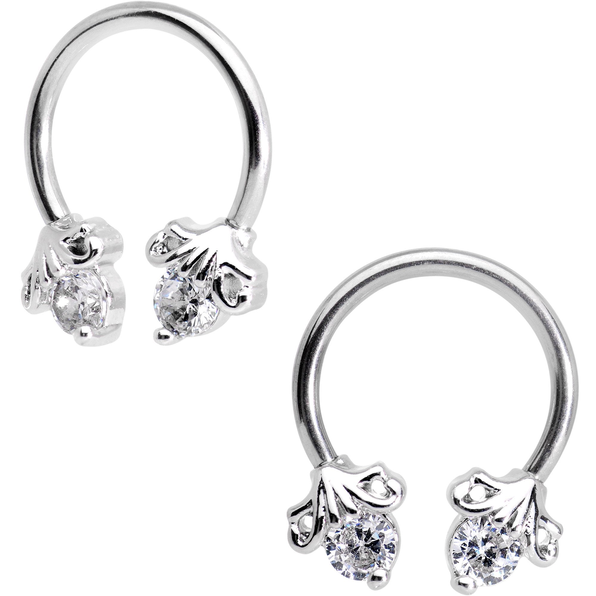This fun set of nipple BCR captive rings and straight barbell nipple rings gives you a lot of options. Wear the matching set of captive rings, the matching set of captive rings, or mix them up! The 16 gauge captive nipple rings are 3/8" in length and are made with durable 316L surgical grade stainless steel. The 3/8" horseshoe barbells are also 16 gauge, feature clear cubic zirconia flower ends, and are made with durable 316L surgical grade stainless steel. Sold as a set of four!