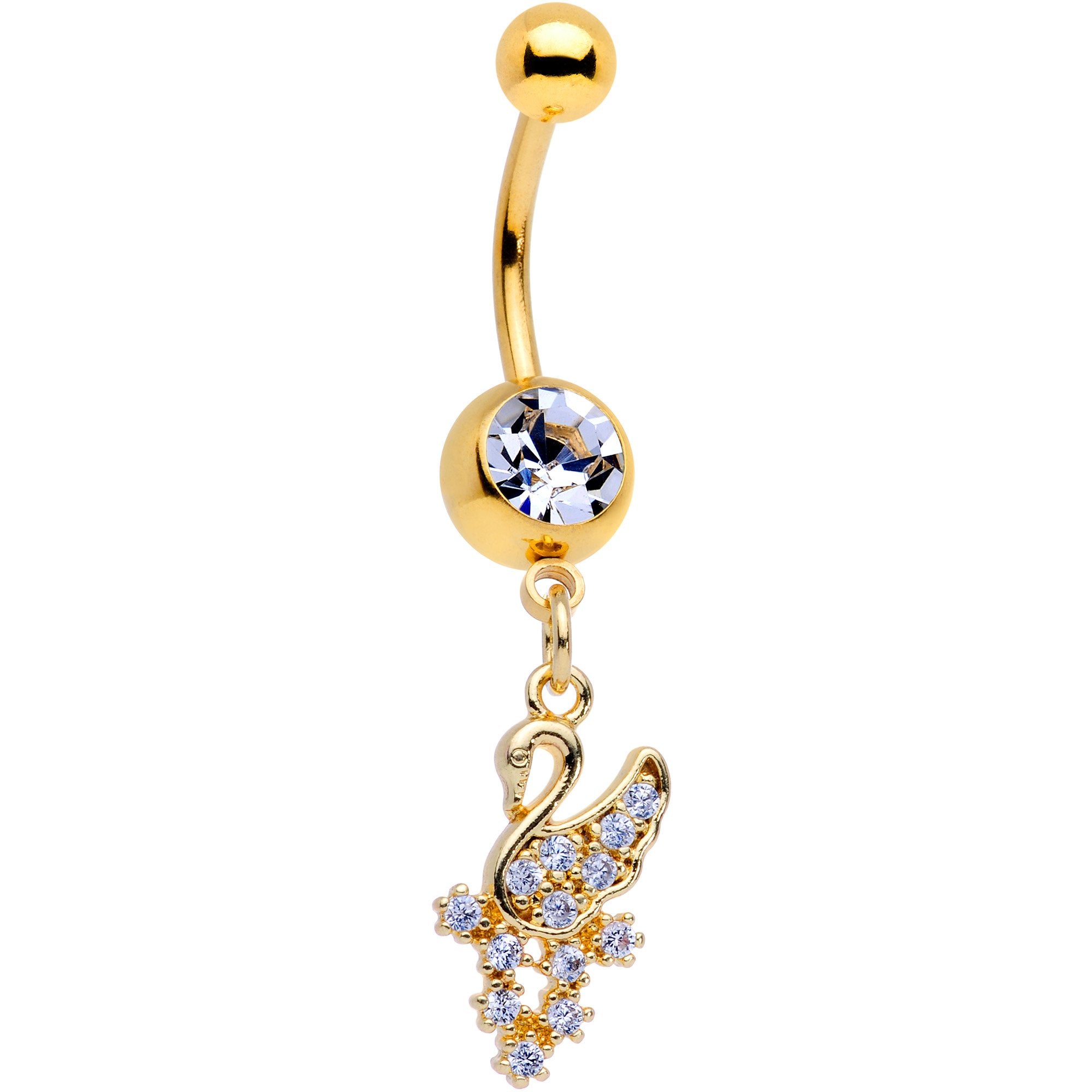 The essence of beauty is captured by this elegant 14 gauge pluming swan belly button ring. A cluster of clear cubic zirconia gems surrounds this sparkling swan charm, which is mounted on a 3/8" curved barbell made with gold PVD over 316L surgical grade stainless steel. A top ball clear gem adds an extra bit of elegance to this stylish belly button ring.