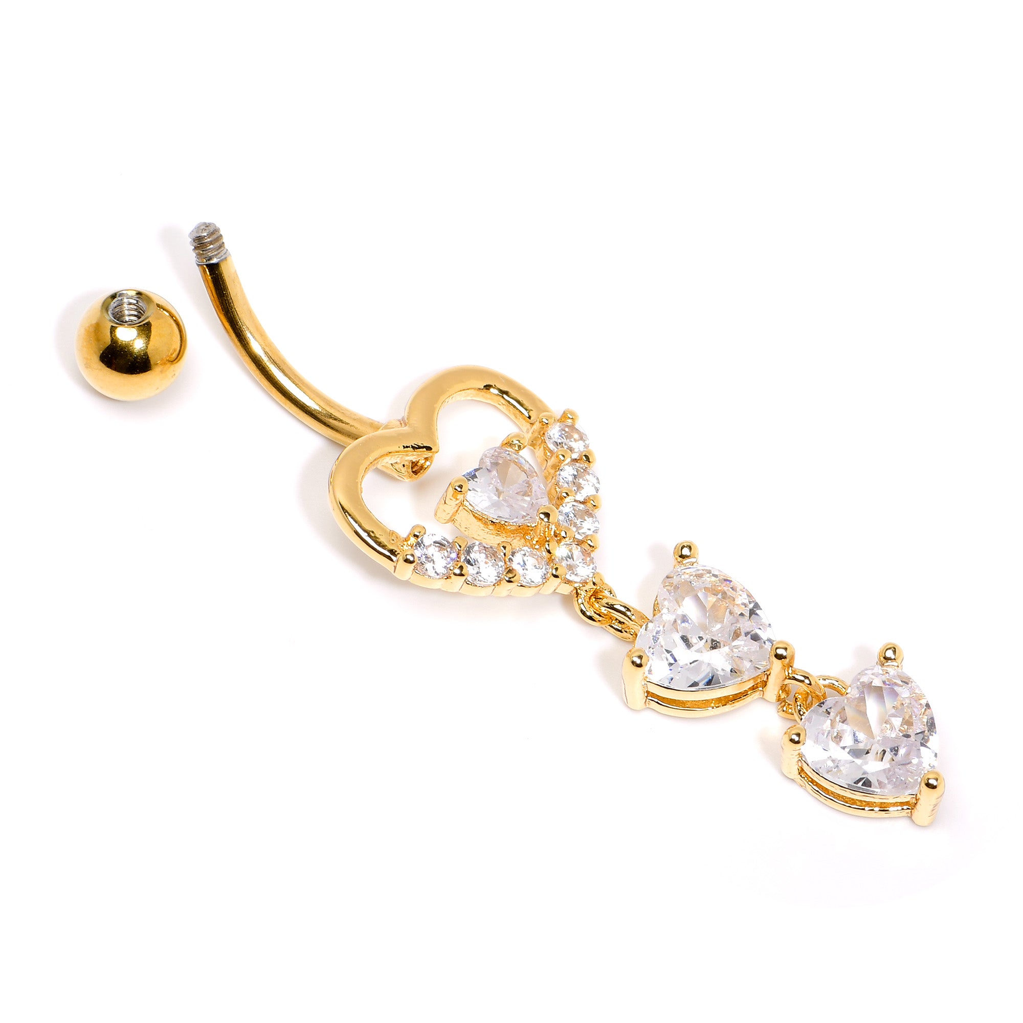 Show your navel piercing four times the love for Valentines Day or any day with the four hearts on this 14 gauge navel ring. It is made with a 3/8 inch gold tone plated over 316L surgical grade stainless steel curved barbell with a 5mm top ball end. The bottom end is a large heart, paved with clear cubic zirconia gems on the bottom and featuring a clear cubic zirconia gem heart at the center. Dangling beneath it are two more matching clear cubic zirconia gem hearts, for a thoroughly opulent look. If body piercing has stolen your heart, celebrate that fact four times over with this charming heart quartet belly piercing ring.