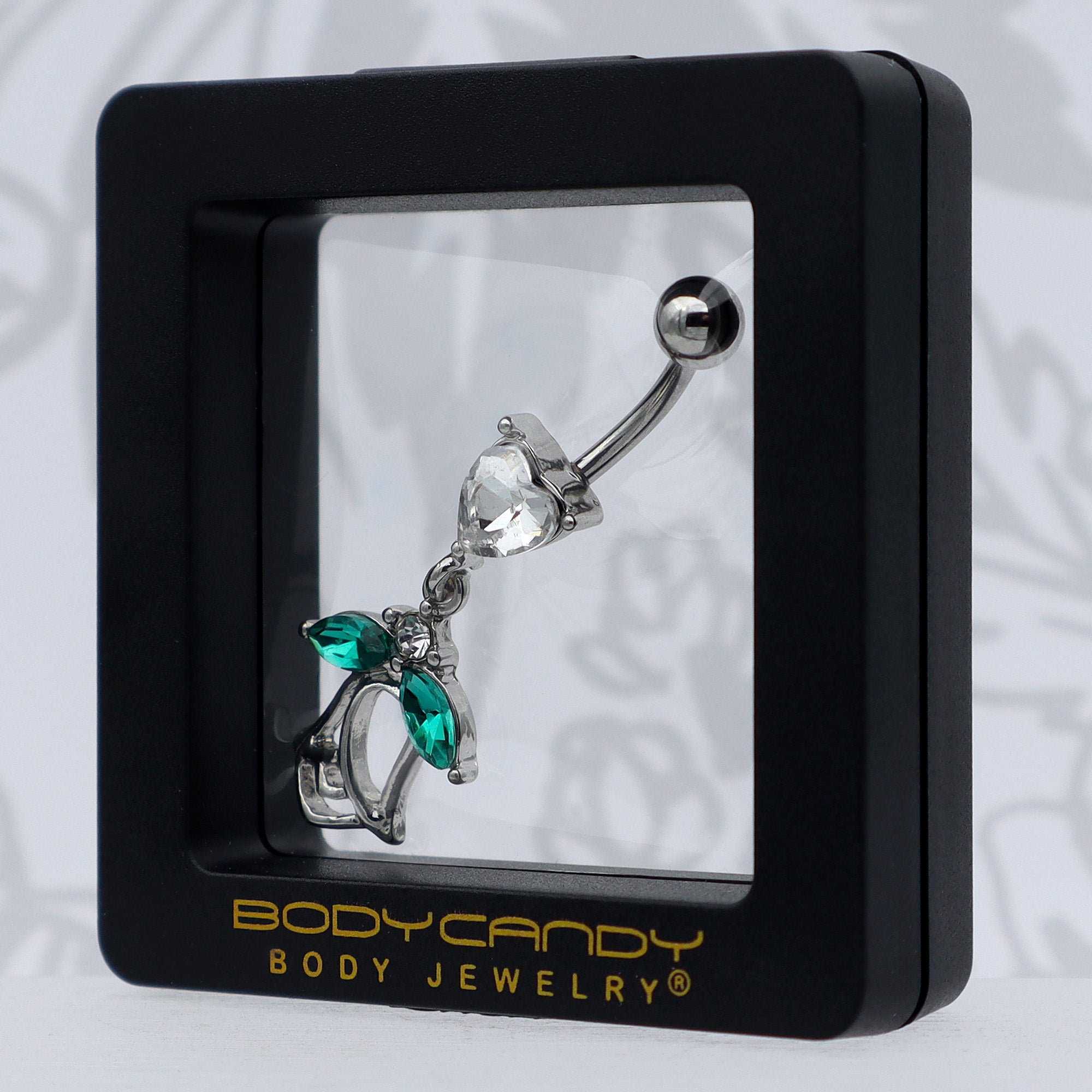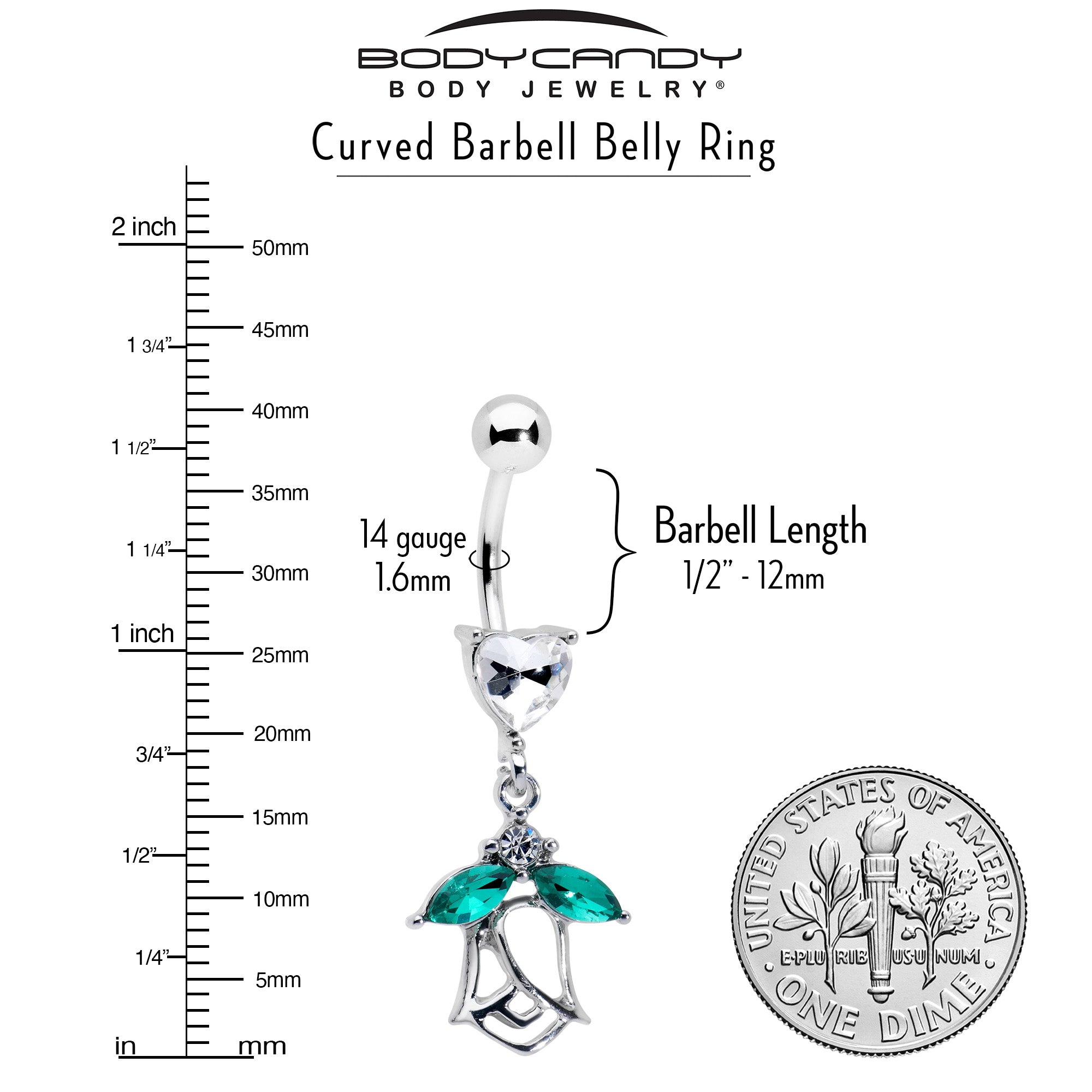 What could be more romantic than this 14 gauge navel jewelry? It is made with a 3/8 inch 316L surgical grade stainless curved barbell with a 5mm top ball end. The bottom features a clear cubic zirconia gem in the shape of a heart. Dangling beneath the heart is a rose charm, with the leaves composed of green cubic zirconia gems and an airy, openwork design. Fall in love with this richly romantic belly piercing ring.