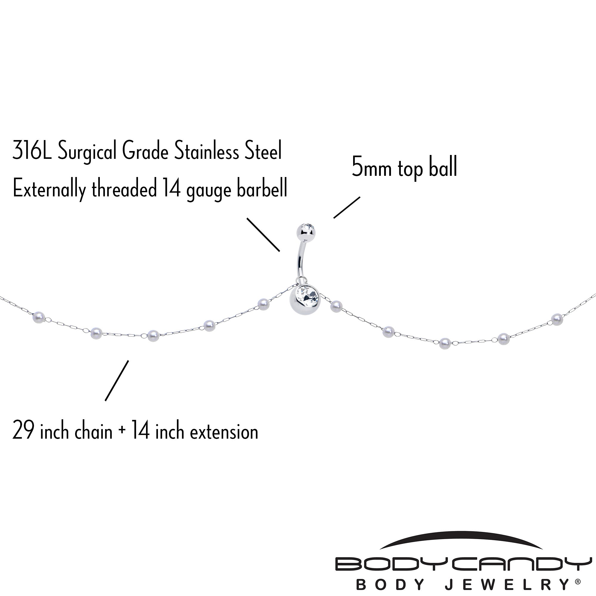 Don't let your midriff go bare when you wear your favorite halter top or belly shirt. This sexy belly chain jewelry is attached to a 14 gauge navel ring made with a 7/16 inch 316L surgical grade stainless steel curved barbell with a 5mm top ball end. The bottom end features a clear cubic zirconia gem. The chain portion is set all along its length with white faux pearls for stunning style. This belly piercing jewelry features a 28.5 inch length waist belt. The waist chain features a lobster clasp used to adjust the length to fit your body.