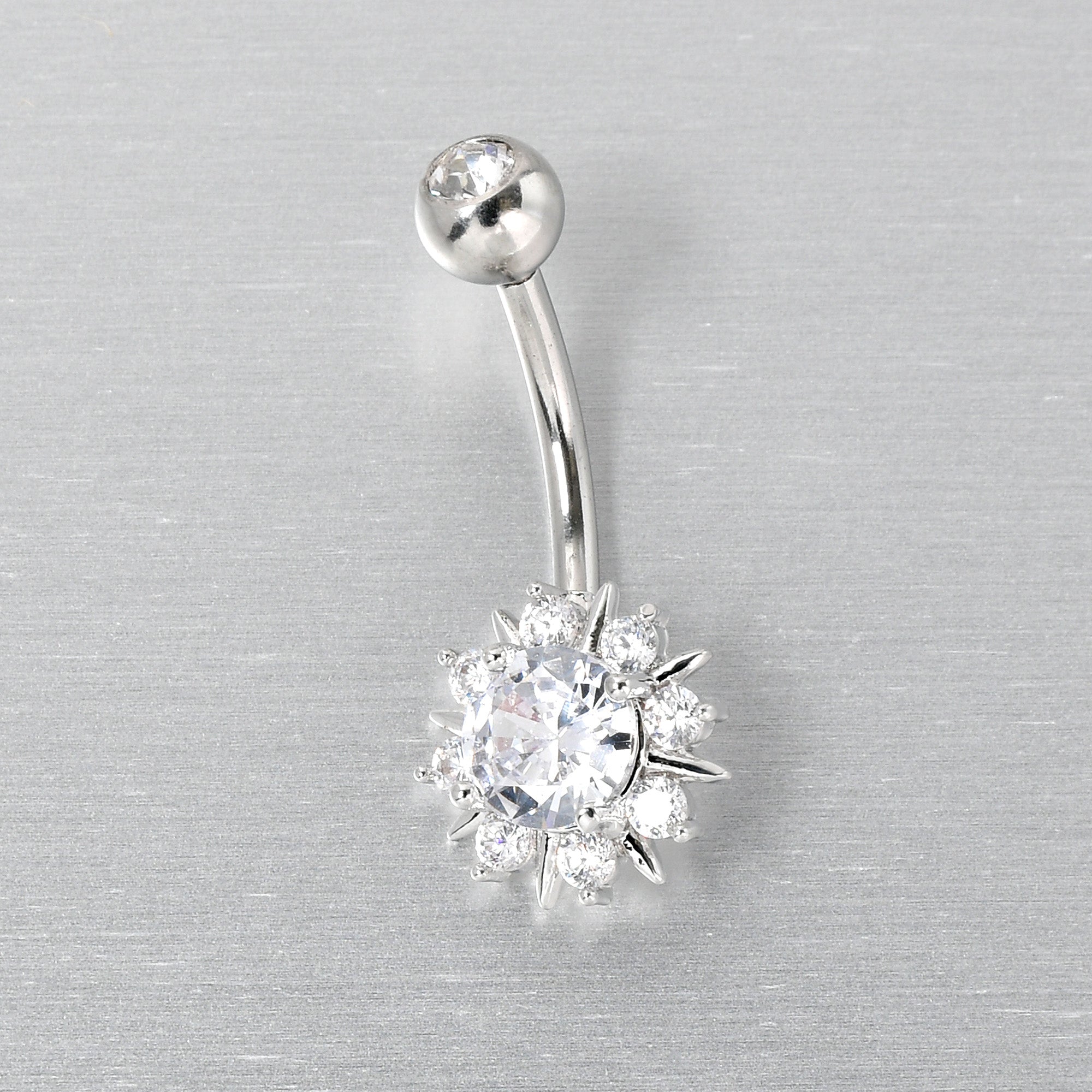 Let the sun shine and take your look uptown with this 14 gauge navel ring It is made with a 10mm durable 316L surgical grade stainless steel curved barbell. The top ball end is 5mm and set with a clear cubic zirconia gem. The bottom end features a sun charm, with a large clear cubic zirconia gem center and smaller clear cubic zirconia gems set among the suns rays. You will be looking sumptuous and sunny with this stylish, solar-themed belly piercing ring.