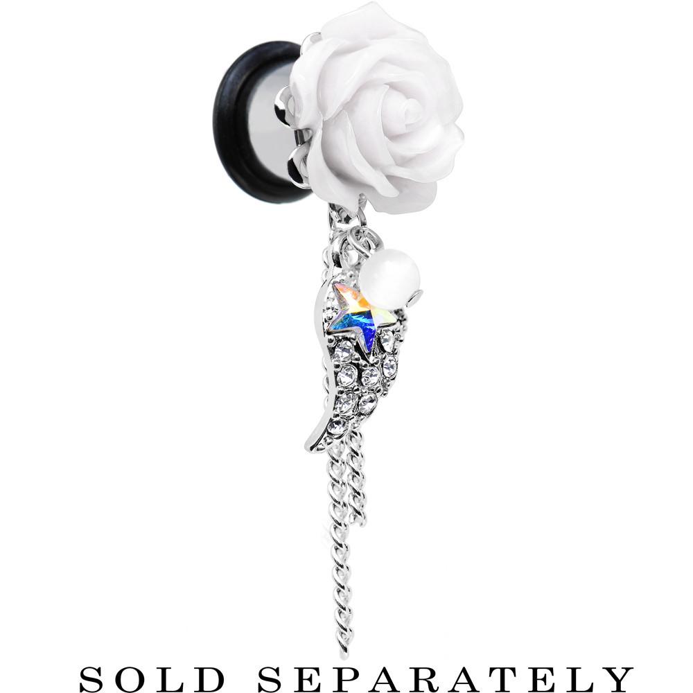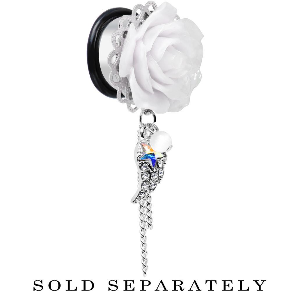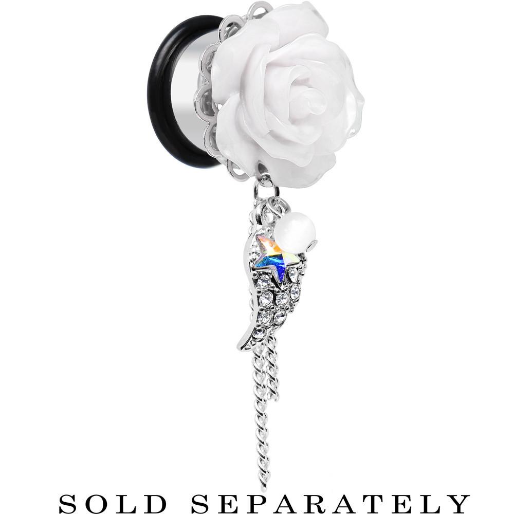 A pair of flower ear gauges for your lobes. Always have the power of an angel nearby with these acrylic white rose stainless steel dangle plugs. Not only does the single flare ear stretcher have a blooming flower, but it also has a dangling clear gem wing with aurora gem star, delicate chains, and a faux pearl. Pierced ear expander ear gauge tunnel plugs includes one rubber O-ring.