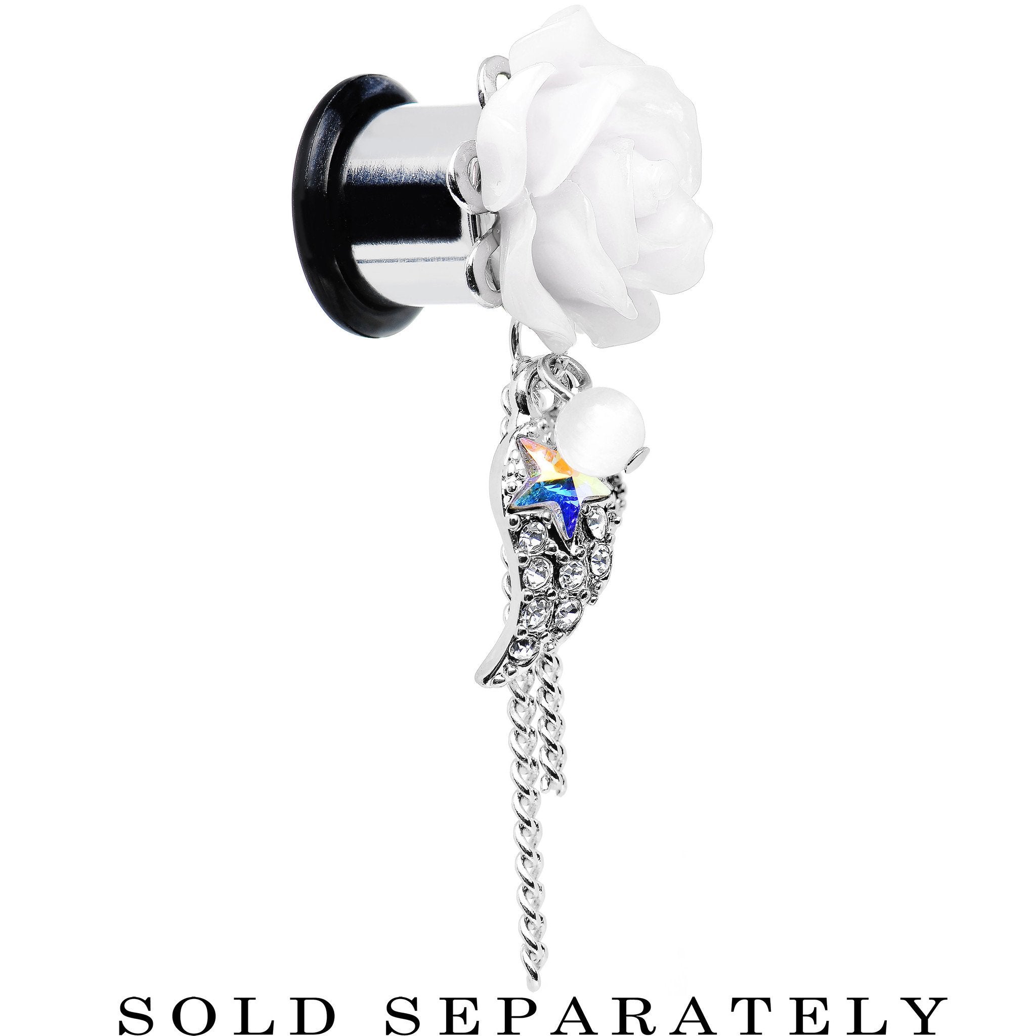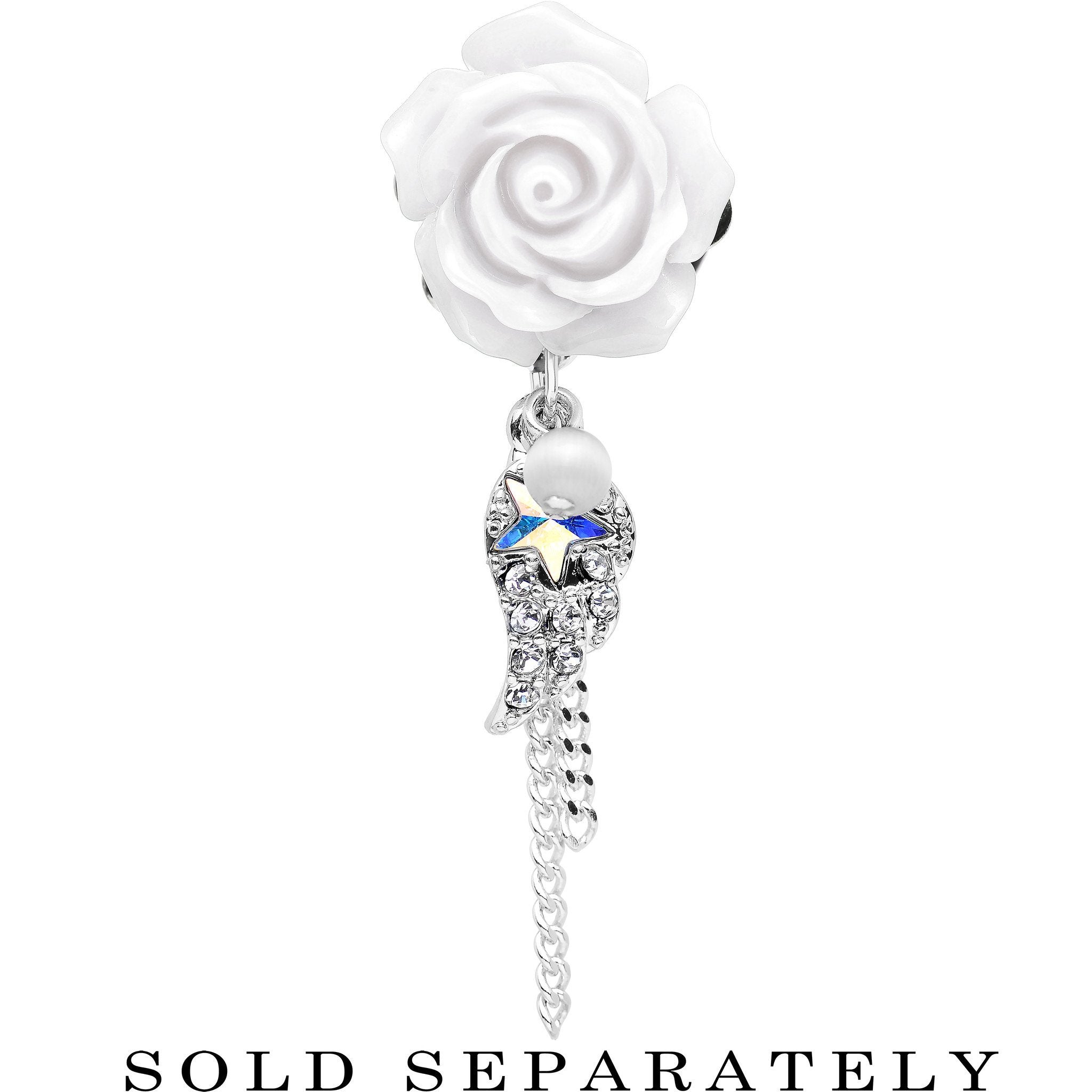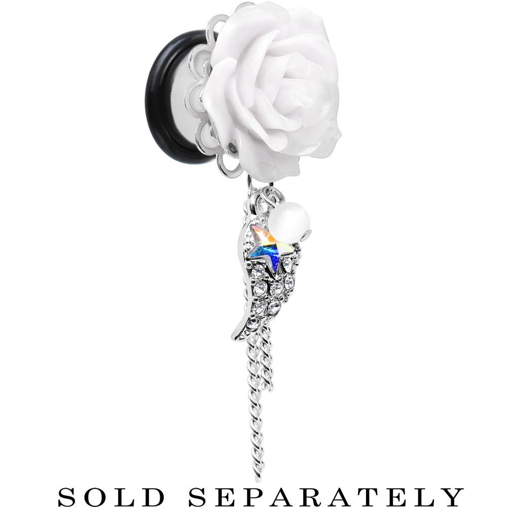 A pair of flower ear gauges for your lobes. Always have the power of an angel nearby with these acrylic white rose stainless steel dangle plugs. Not only does the single flare ear stretcher have a blooming flower, but it also has a dangling clear gem wing with aurora gem star, delicate chains, and a faux pearl. Pierced ear expander ear gauge tunnel plugs includes one rubber O-ring.