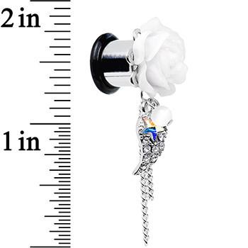 Clear Gem Angel Wing and White Rose Flower Single Flare Dangle Plug Sizes 6mm to 16mm