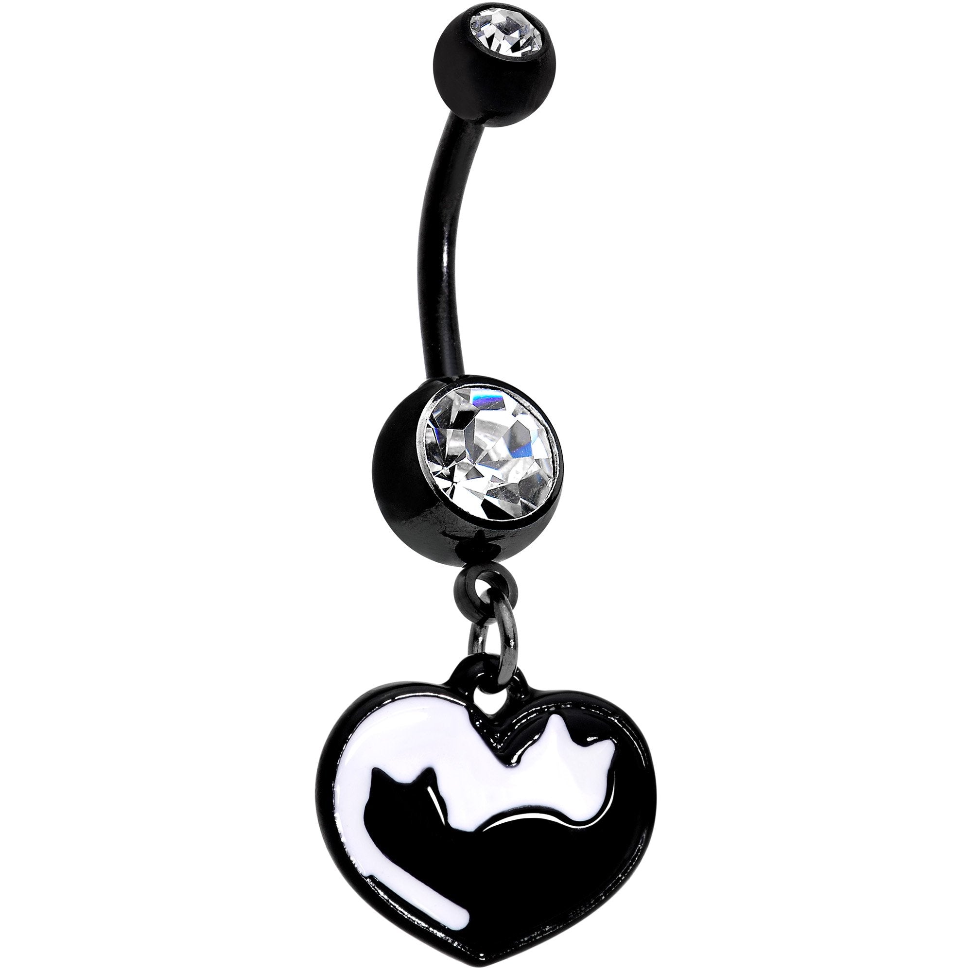 This 14 gauge belly button ring is just purr-fect for expressing how much you love cats! Made with a 7/16" black plated durable 316L surgical stainless steel curved barbell, it has clear gems set into the 5mm top ball end and 8mm bottom ball end. Dangling from the bottom ball end is a heart shaped charm with what appears to be a white color silhouette of a feline in repose. But take a closer look - the space around our feline friend is a mirror image of another relaxing kitty in black, forming a design reminiscent of a traditional Yin-Yang symbol. If you love cats, you need to get your paws on this navel ring!