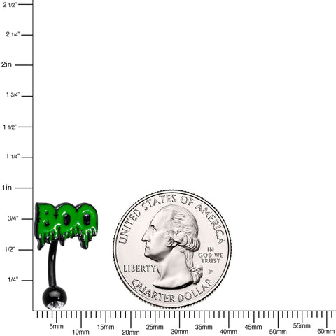 You'll be looking absolutely boo-tiful in this 14 gauge navel ring! It's made with a 3/8" black PVD over 316L surgical grade stainless steel curved barbell. It has a 5mm bottom ball end, which is set with a clear gem. The top end features the word boo, in a vivid shade of green. It's even written in a creepy ooze-inspired font for an absolutely bloodcurdling effect! Change your navel jewelry from "ew" to "woo!" with this creepy Halloween "boo" belly button jewelry!