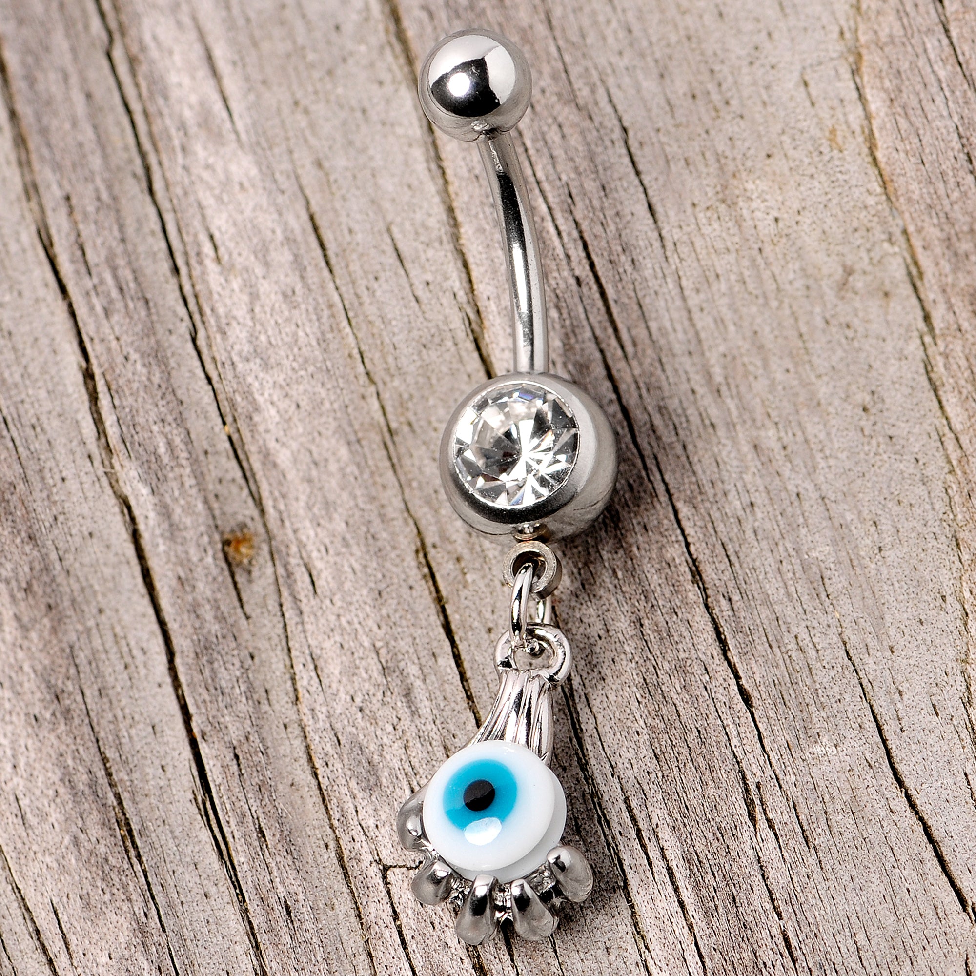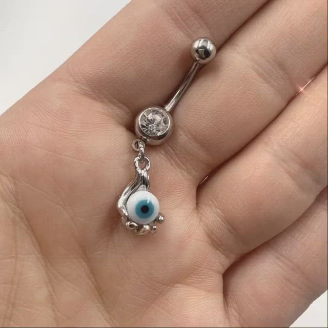 Clear Gem Blue Eyeball Hand Halloween Dangle Belly Ring