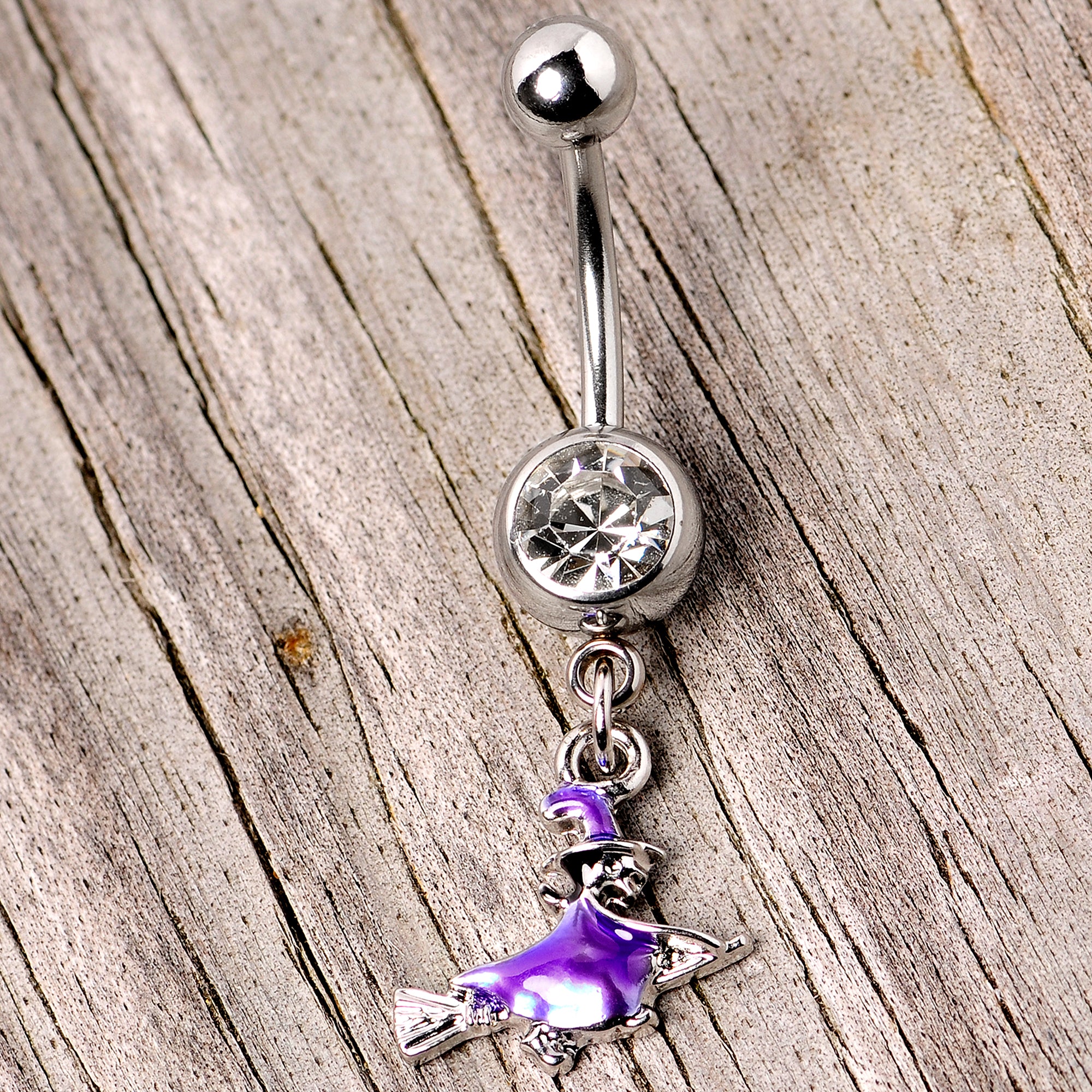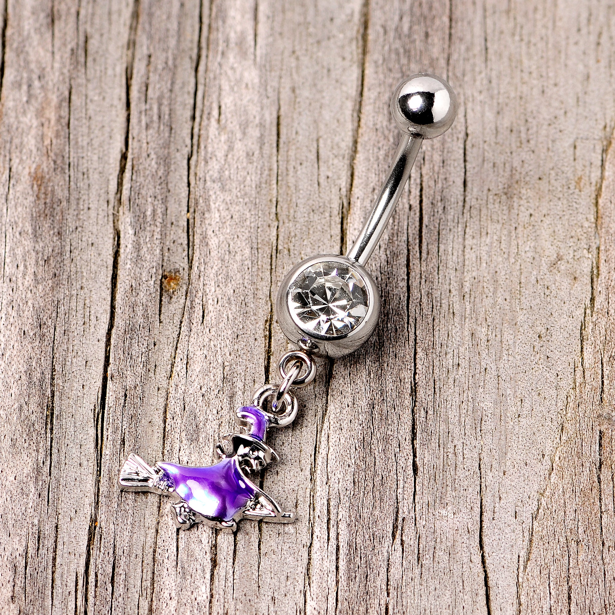 Who is that zooming through the night sky on a broom? It's the witch featured on this 14 gauge navel ring! It's made with a 7/16" durable 316L surgical grade stainless steel curved barbell and has a 5mm top ball end. The bottom ball end is 8mm and set with a large clear gem. Dangling from the base is witch charm wearing a blue dress and hat as she sits perched on her broom. This witch is sure to make some magic in your navel piercing with this classic belly button ring!