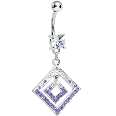Loving something square was never so cool, and this square-within-a-square navel ring also throws in glam for good measure. Two clear and purple gem paved diamond shapes are layered within one another and dangle from a classic curved barbell and clear prong set gem. Pierced dangling belly button ring Body Jewelry./font>