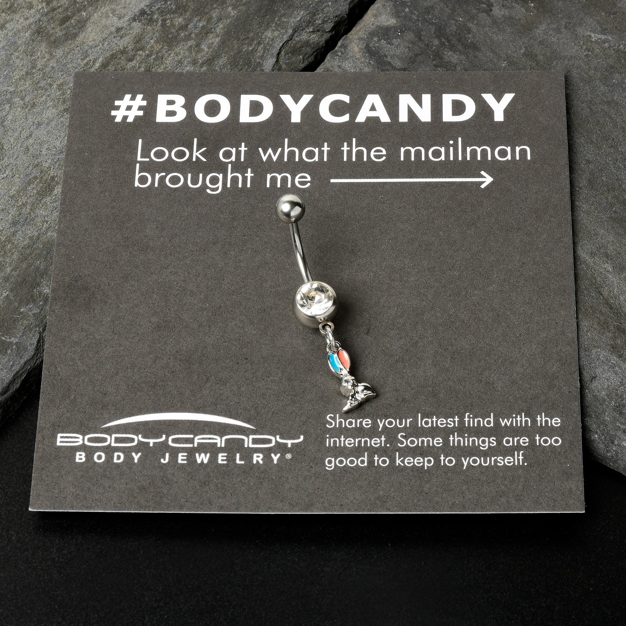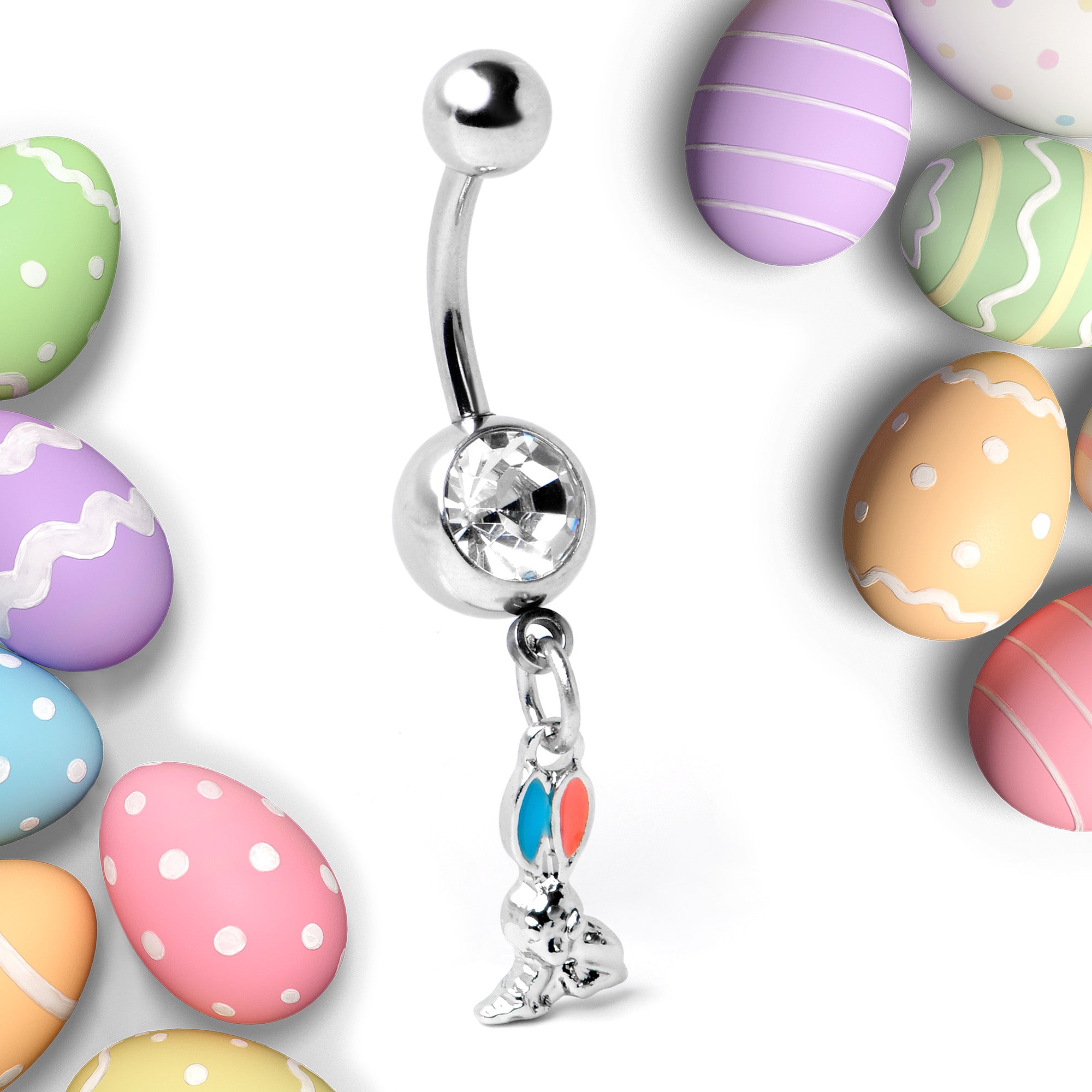 Hop into holiday style with this 14 gauge navel ring! It's made with a 3/8" durable 316L surgical grade stainless steel curved barbell with a 5mm top ball end. The bottom ball end is 8mm and set with a large clear gem. Dangling beneath it is an Easter bunny charm. The bunny is embellished with red inlay in one ear and blue inlay in the other ear, for a festive splash of color you can't ignore. Go down a rabbit hole of color and fashion with this festive Easter belly piercing ring.