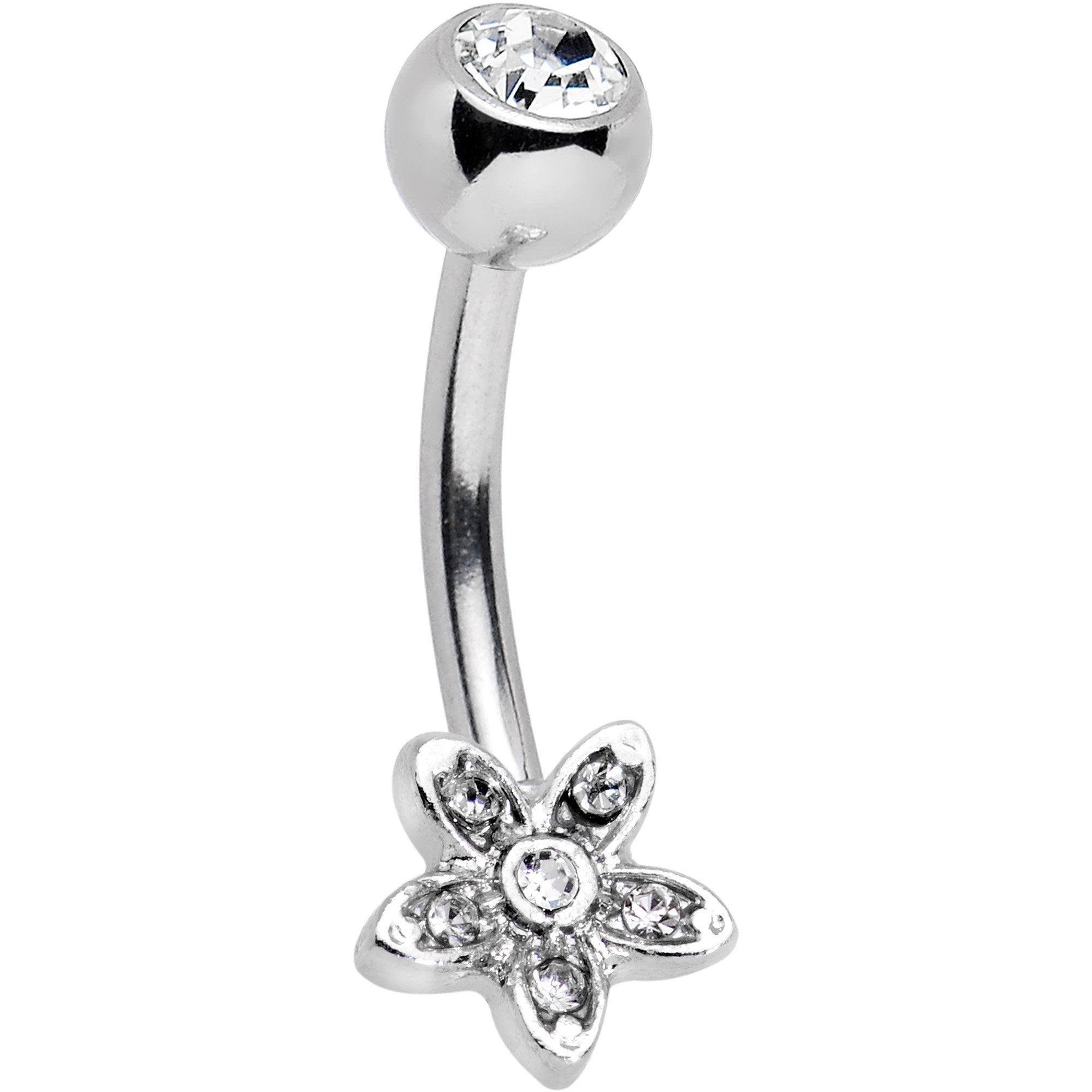 Wow, smell those freshly cut flowers! This beautiful 14 gauge dangle belly ring features a whole field of beautiful flowers! A trio of five petal flowers encrusted with clear gems is mounted on a 7/16" curved barbell made with durable 316L surgical grade stainless steel complete with a flower charm bottom accent and a top clear gem ball. Upgrade your belly button jewelry with this glamorous piercing today!