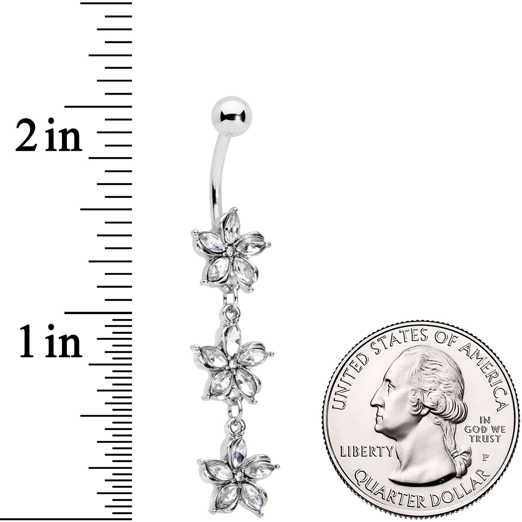 They say bad things come in threes but this 14 gauge navel ring proves them wrong! It's made with a 3/8" durable 316L surgical grade stainless steel curved barbell with a 5mm top ball end. The bottom end features a flower, composed of clear gem petals. Dangling beneath it are two more identical flowers, forming a vertical garland. Let this little garden make your belly piercing bloom with this fantastic floral belly button jewelry!