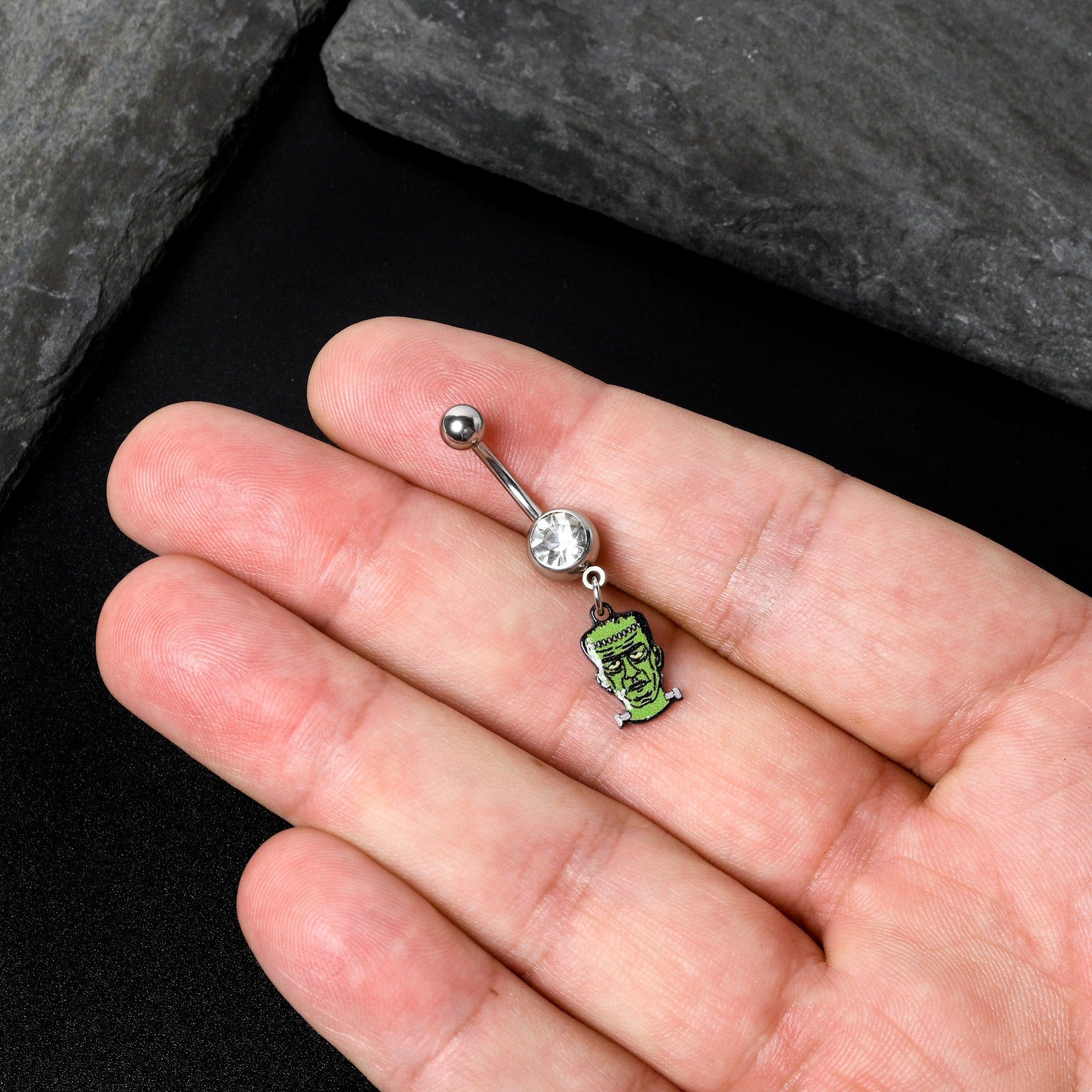 It's alive....or it certainly looks lifelike on this 14 gauge navel ring! It's made with a 3/8" durable 316L surgical grade stainless steel curved barbell with a 5mm top ball end. The bottom ball end is 8mm and set with a clear gem. Dangling beneath is a Frankenstein's monster charm, from the neck up. The monster's head is green and features a realistically expressionless expression. It glows in the dark when the lights go down for a truly unearthly look. Grab your pitchforks and torches, Frankenstein's monster is loose when you're rocking this wonderfully horrifying belly piercing ring!