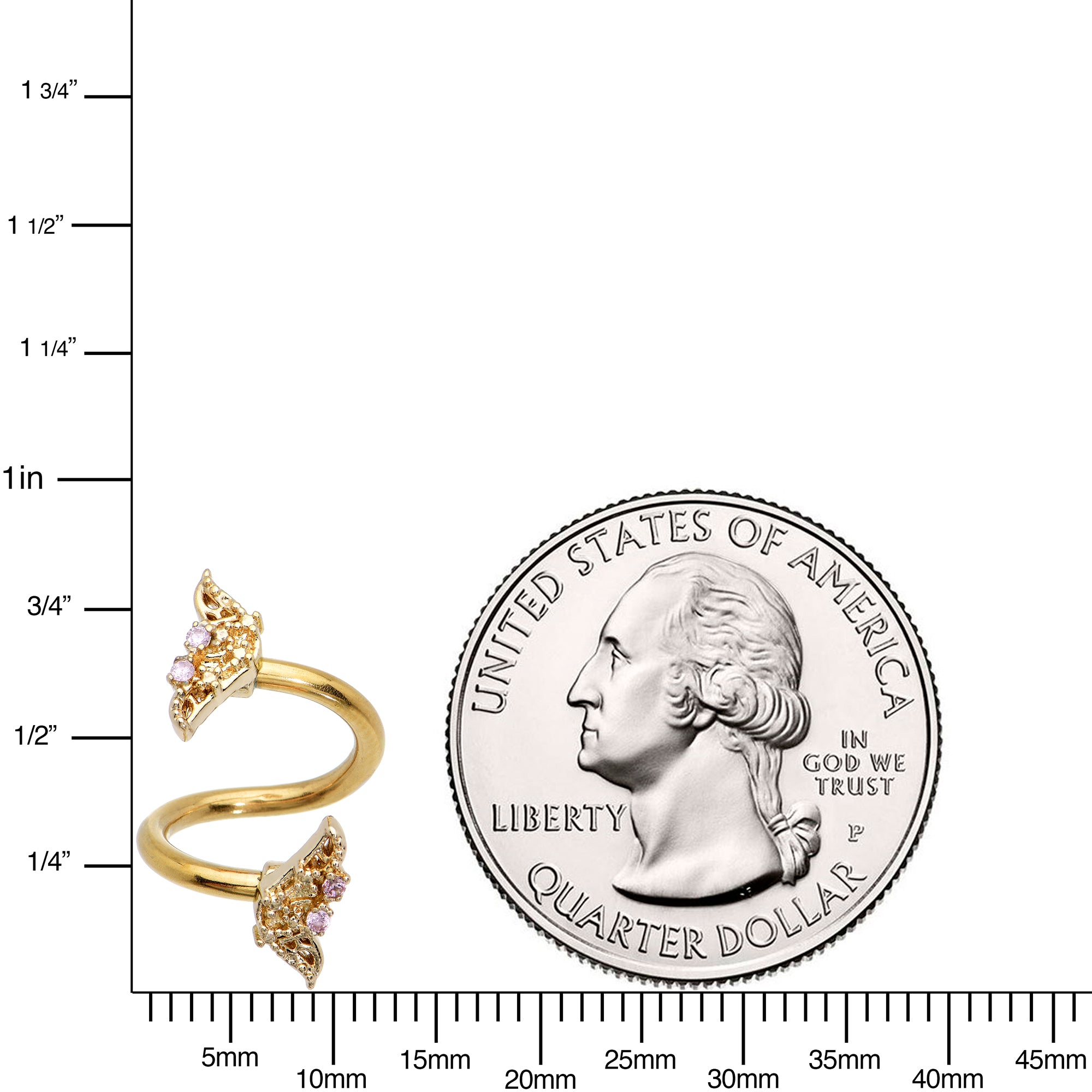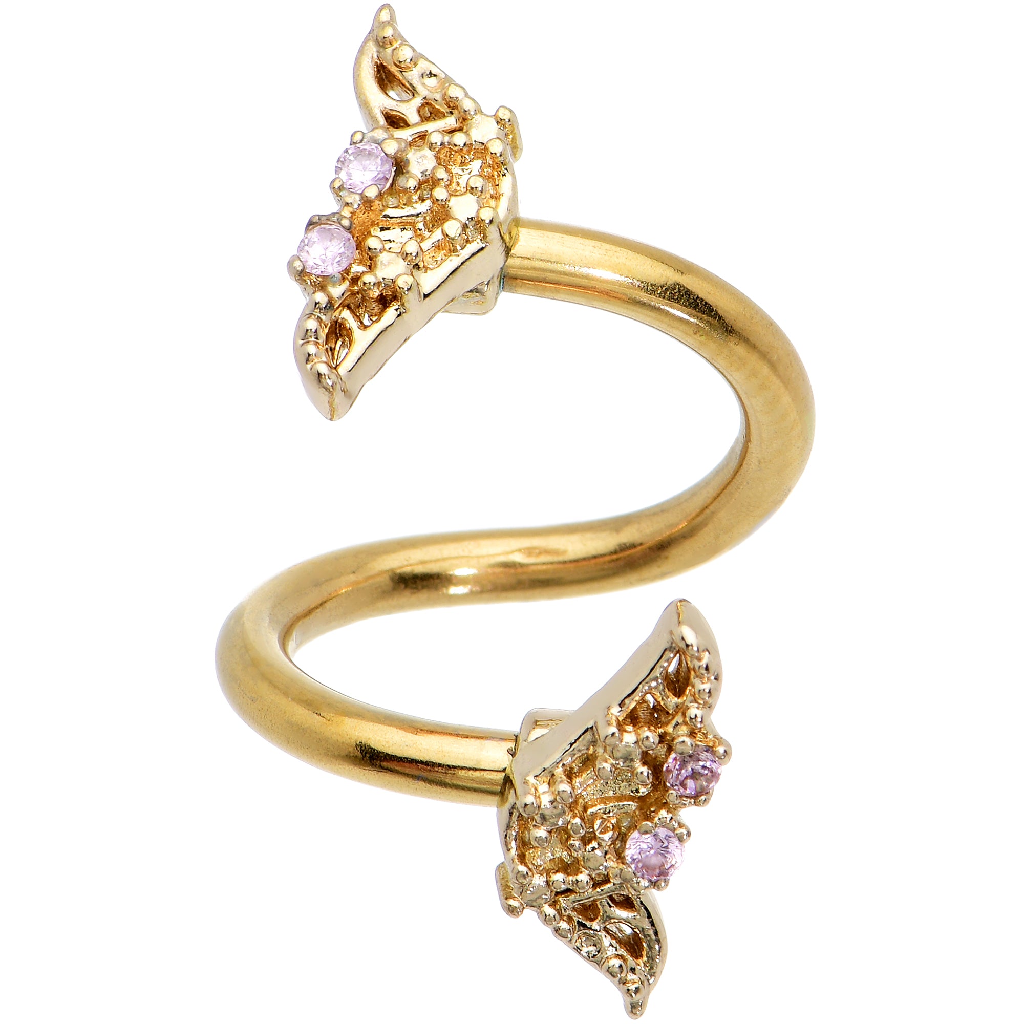 Spread your wings with this 14 gauge belly button ring! It's made with a 3/8" gold tone PVD over 316L surgical grade stainless spiral curved barbell. The ends each feature a single butterfly wing, with intricate detailing for an elegant look. Each wing is set with two clear gems and can be worn in multiple piercings including the belly button, lip, some eyebrow piercings, and some cartilage piercings such as the helix. Let your look soar with the wonderful wings on this navel ring!