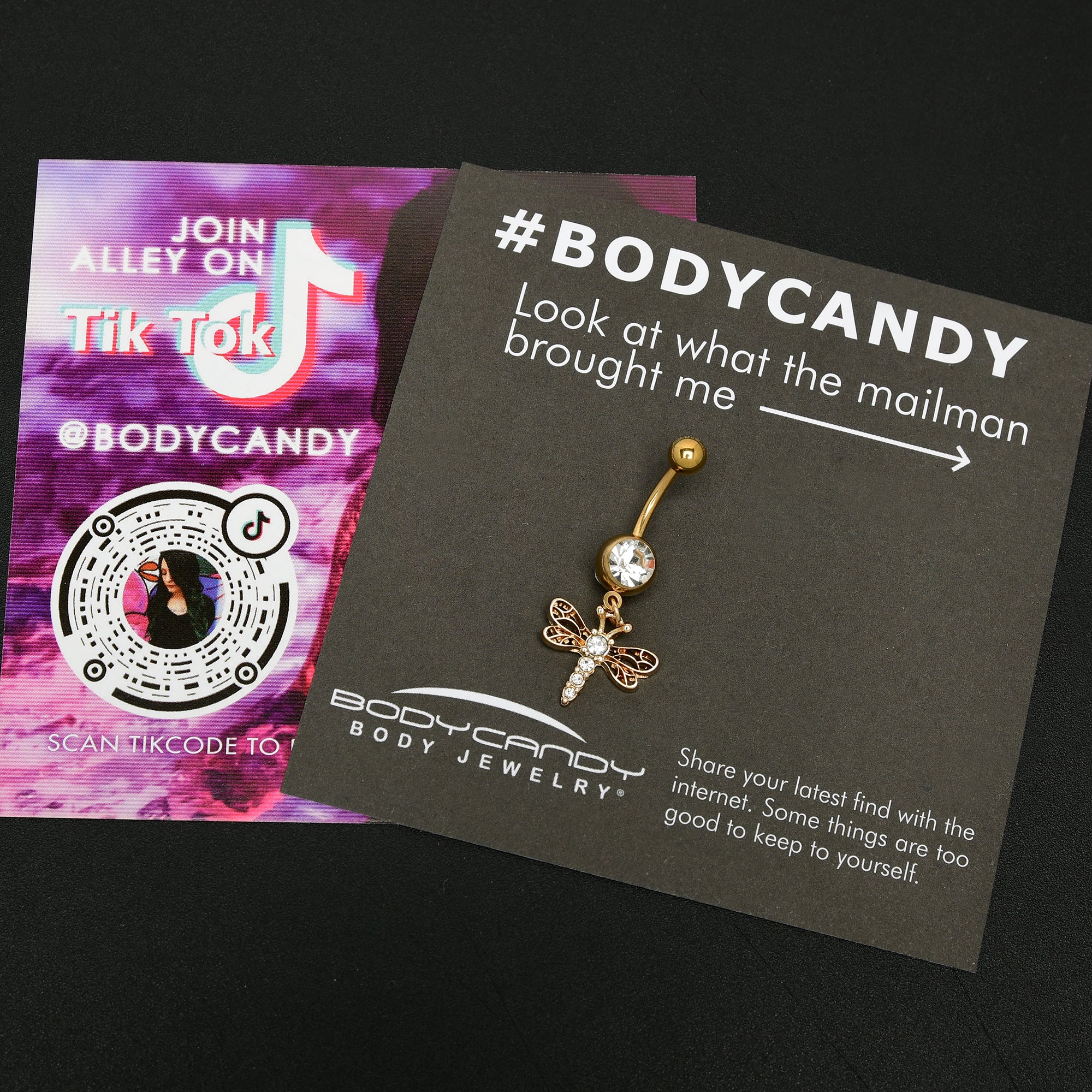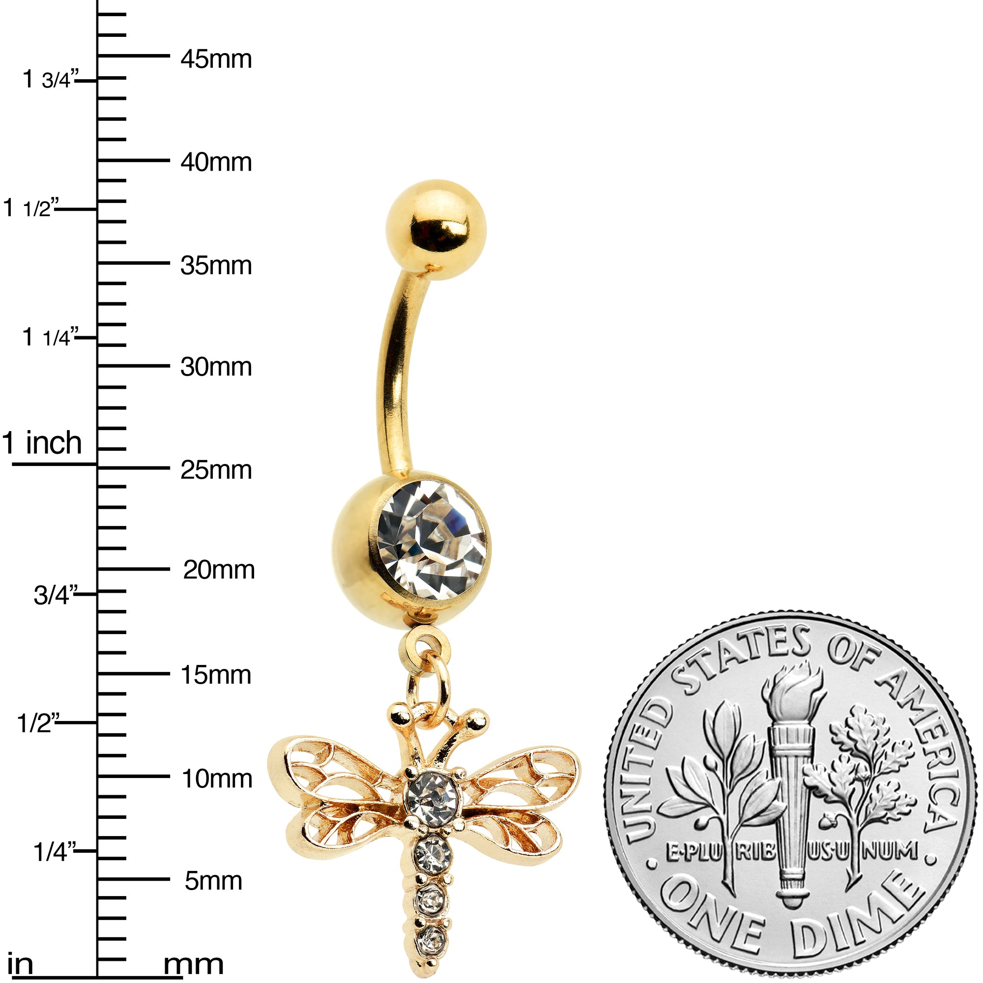 Let your look soar with this 14 gauge navel ring! It's made with a 3/8" gold tone PVD over 316L surgical grade stainless steel curved barbell with a 5mm top ball end. The bottom ball end is 8mm and set with a large clear gem. Dangling beneath it is a dragonfly charm. The dragonfly features openwork wings and a body and tail composed entirely of small clear gems. You'll want to fly too when you're rocking this darling, dragonfly belly piercing ring!