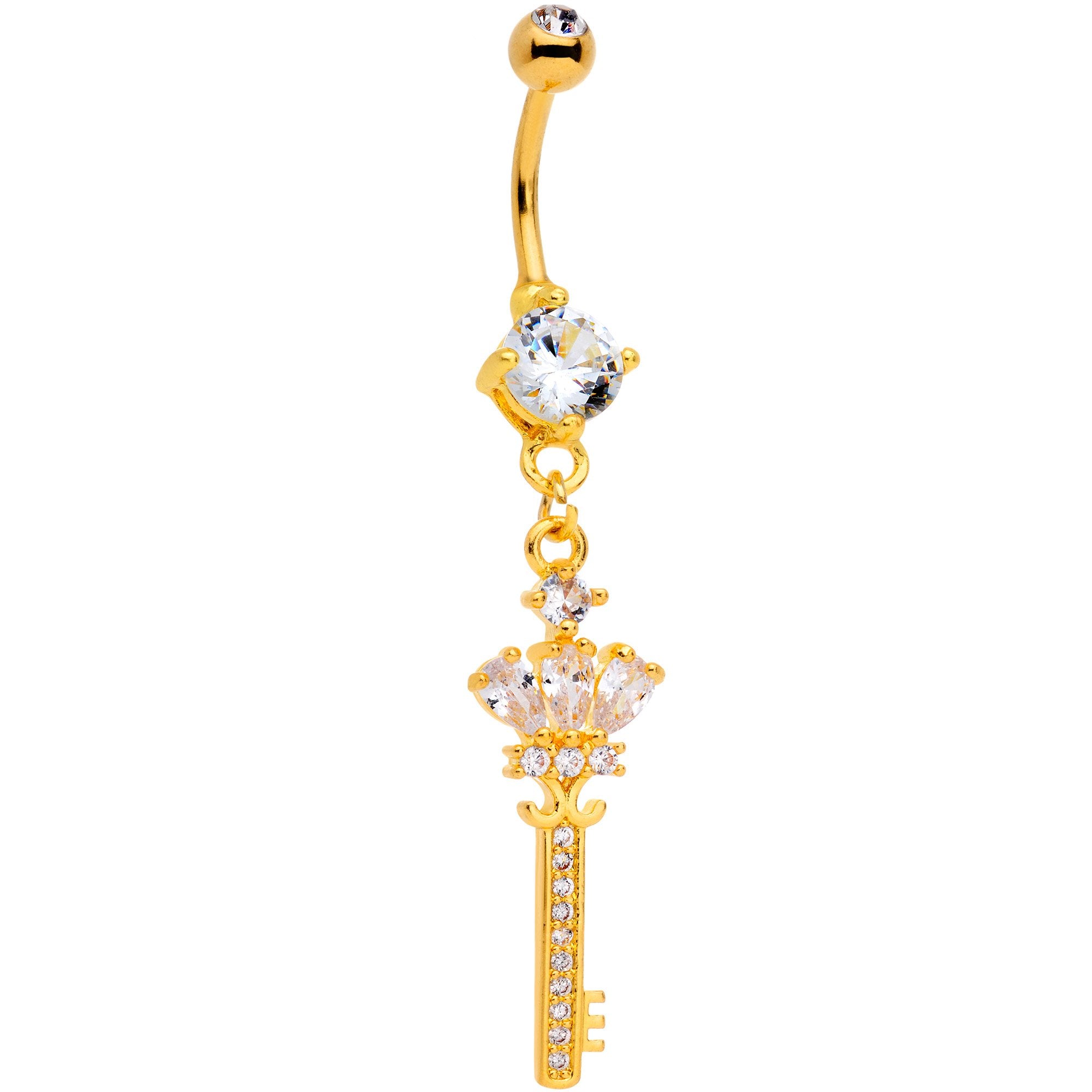 If you like your look locked down with fun fashion then this 14 gauge belly button ring is worth a peek. Made with a 7/16" gold tone anodized over 316L surgical grade stainless steel curved barbell, this navel ring features clear top and bottom gems as well as a key dangle charm set with clear gems.