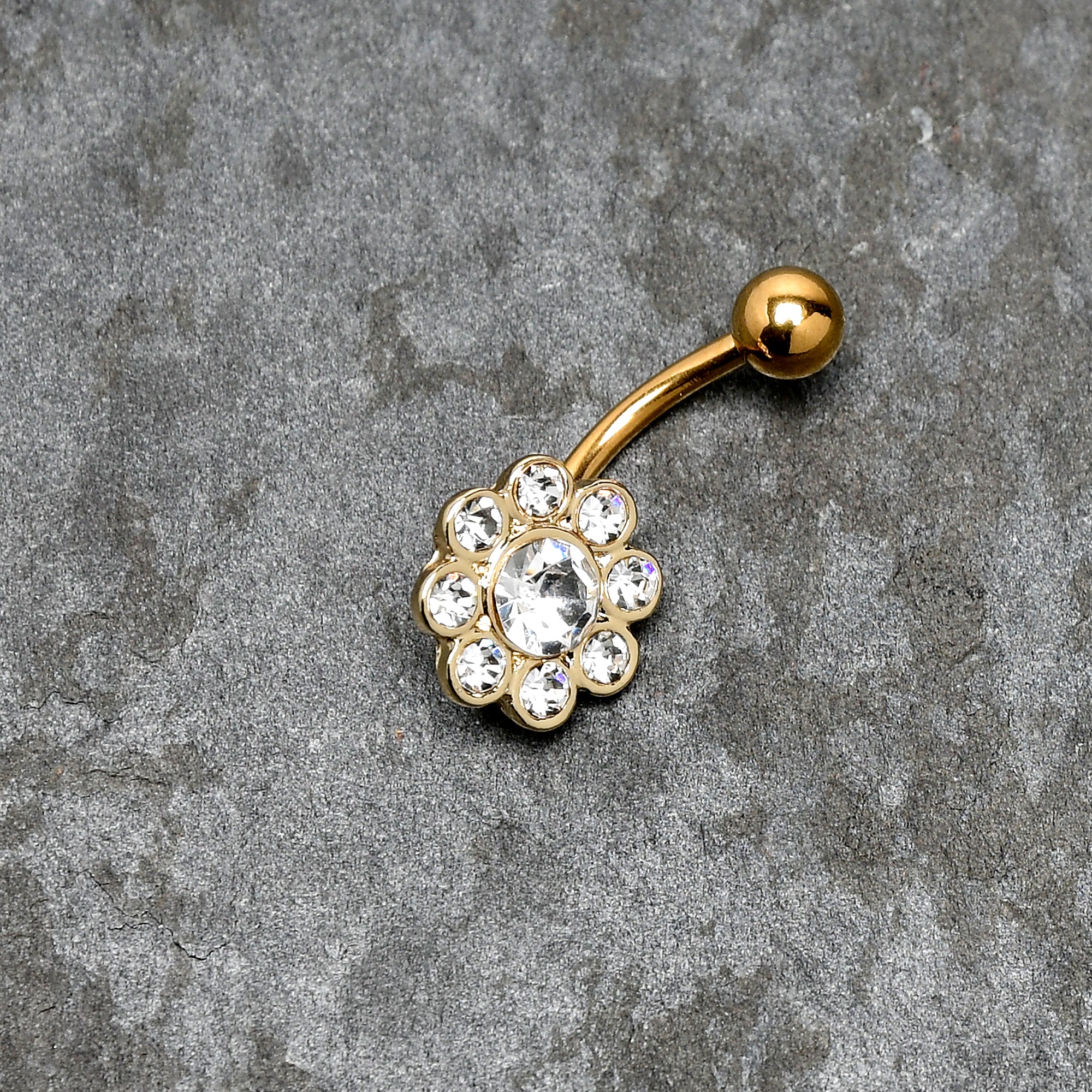 Add some floral whimsy to your look with this 14 gauge navel ring! It's made with a 3/8" gold tone electroplate over 316L surgical grade stainless steel curved barbell with a 5mm top ball end. The bottom end features a cheery flower charm, with the center and petals all composed of individual clear gems. The overall look is charmingly upbeat. You'll bring a smile to everyone's face when you're rocking this endearing floral belly piercing ring!