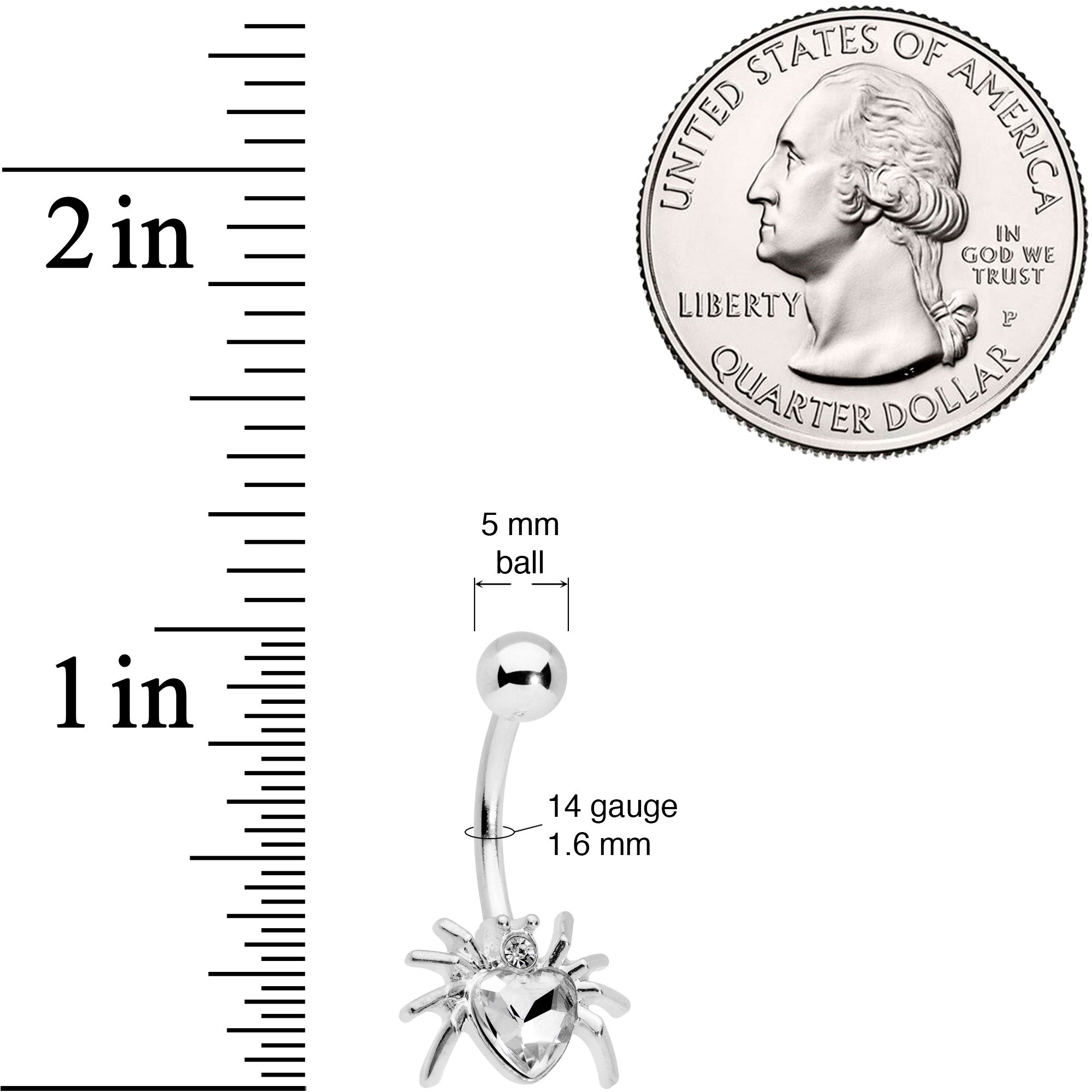This spider body jewelry will give you the Halloween shivers.....but not shivers of fear! This 14 gauge navel ring is made with a 7/16" durable 316L surgical grade stainless steel curved barbell and has a 5mm top ball end. The bottom end is a spider charm with the body made of a Valentine's Day heart-shaped clear gem and the head composed of a smaller clear gem. So whether you cherish creepy crawlies or appreciate arachnids, this belly button ring is sure to snare you in its web!