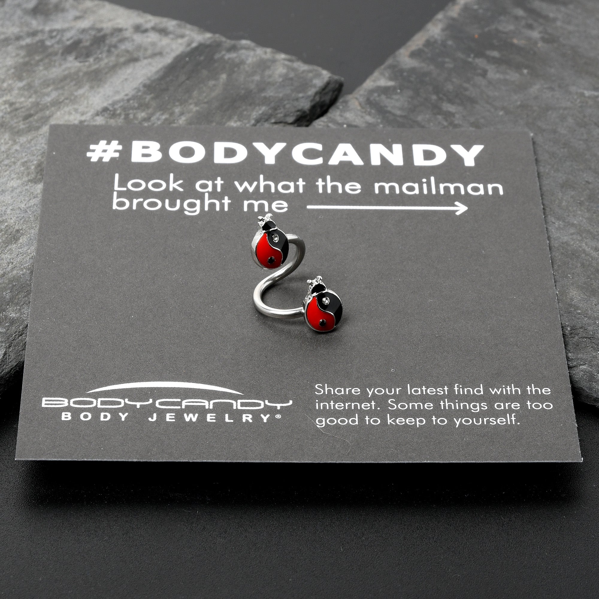 Get a whimsical look with a spiritual touch with this 14 gauge navel ring. It is made with a 3/8 inch 316L surgical grade stainless steel spiral curved barbell. Each of the ends features a ladybug charm. The ladybugs have a yin yang symbol on their backs, inlaid in red and black. They are each further embellished with a single clear gem for an added touch of style. You can even rock these ladies in multiple piercings including lip, some eyebrow, and some helix piercings. You are sure to love this ladybug belly piercing ring all the down to your soul.