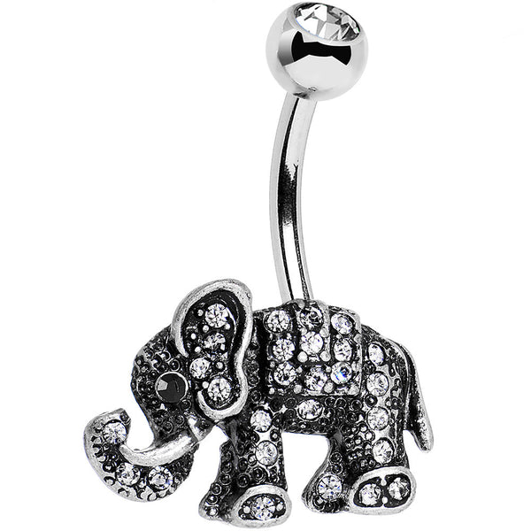 Get in touch with your favorite part of nature when you wear this animal-inspired navel piercing! Made with a 3/8" surgical grade stainless steel curved barbell, this belly button ring features a clear top gem as well as an elephant bottom charm dressed in his blanket best and set with a series of clear gems. Whether you are ready to ride away with the spirit of fashion fun or are all about elephants this navel jewelry is perfect for you!