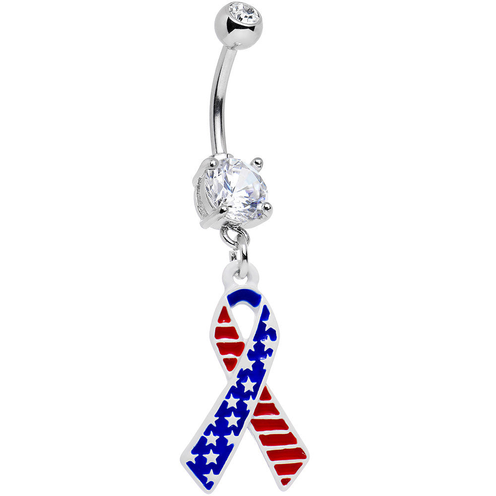 Show the world that your heart beats for the red, white, and blue when you wear this patriotic belly button ring. Made with a 3/8" surgical grade stainless steel curved barbell, this navel piercing features clear top and bottom gems as well as a patriotic red, white, and blue cause ribbon. Show off the colors of your homeland wherever you go when you add this unique selection to your navel jewelry collection.