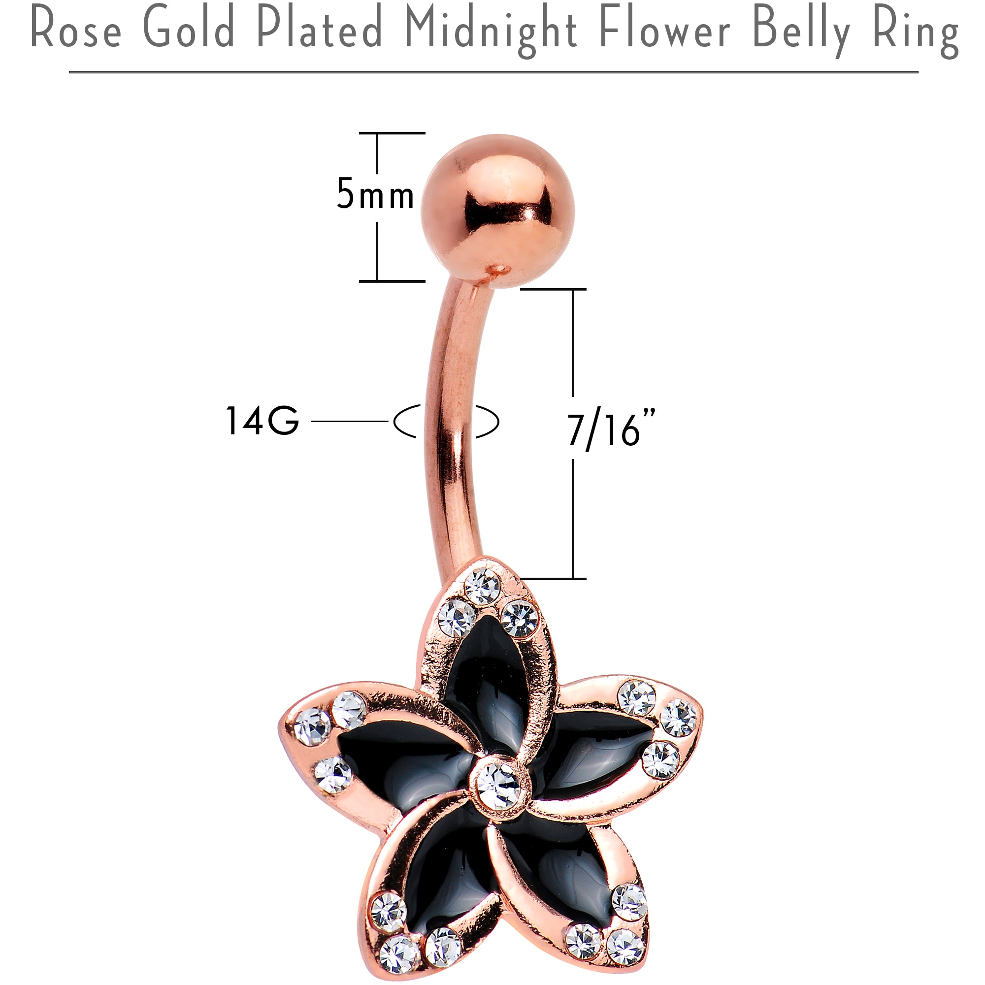 Midnight sparkles bright with this amazing rose gold plated dark flower belly ring for women. Clear gems glimmer against the dark petals for a chic look. Navel ring crafted from rose gold plated surgical grade stainless steel. Flower belly ring body pierc