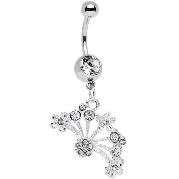 Grab a bouquet of sparkle galore with this dangle belly ring featuring a multitude of floral arrangements in its dangling design. The 7/16" curved barbell of this navel jewelry is made of 316L surgical grade stainless steel and the dangling design, as well as the bottom ball end, is highlighted by clear gems.