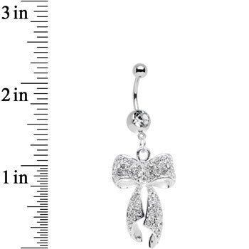 Hypoallergenic jewelry for sensitive skinPut a bow on top (or in this case on the bottom) of your stylish navel piercing with this dangle belly ring featuring an embellished bow charm decorated with clear gems. The 7/16" long 316L surgical grade stainless steel curved barbell includes a 5mm top ball end and a bottom single gem ball.