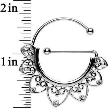 Hypoallergenic jewelry for sensitive skinThe next level in nipple piercing jewelry is here with this 14 gauge universal nipple ring set that can be worn vertically or horizontally with a simple turn of the rotating barbell. So, no matter how your nipples may be pierced, find solace in knowing that this body jewelry will have you covered with its 16mm 316L surgical grade stainless steel barbells with a moveable design of filigree scrolling hearts with clear gem details. This universal nipple jewelry includes 4mm ball ends and features a top opening of 15mm in diameter, a bottom opening measuring 13mm in diameter, and is sold as a set of two.