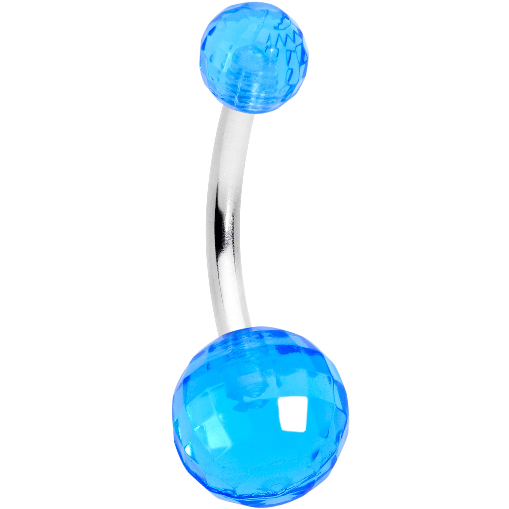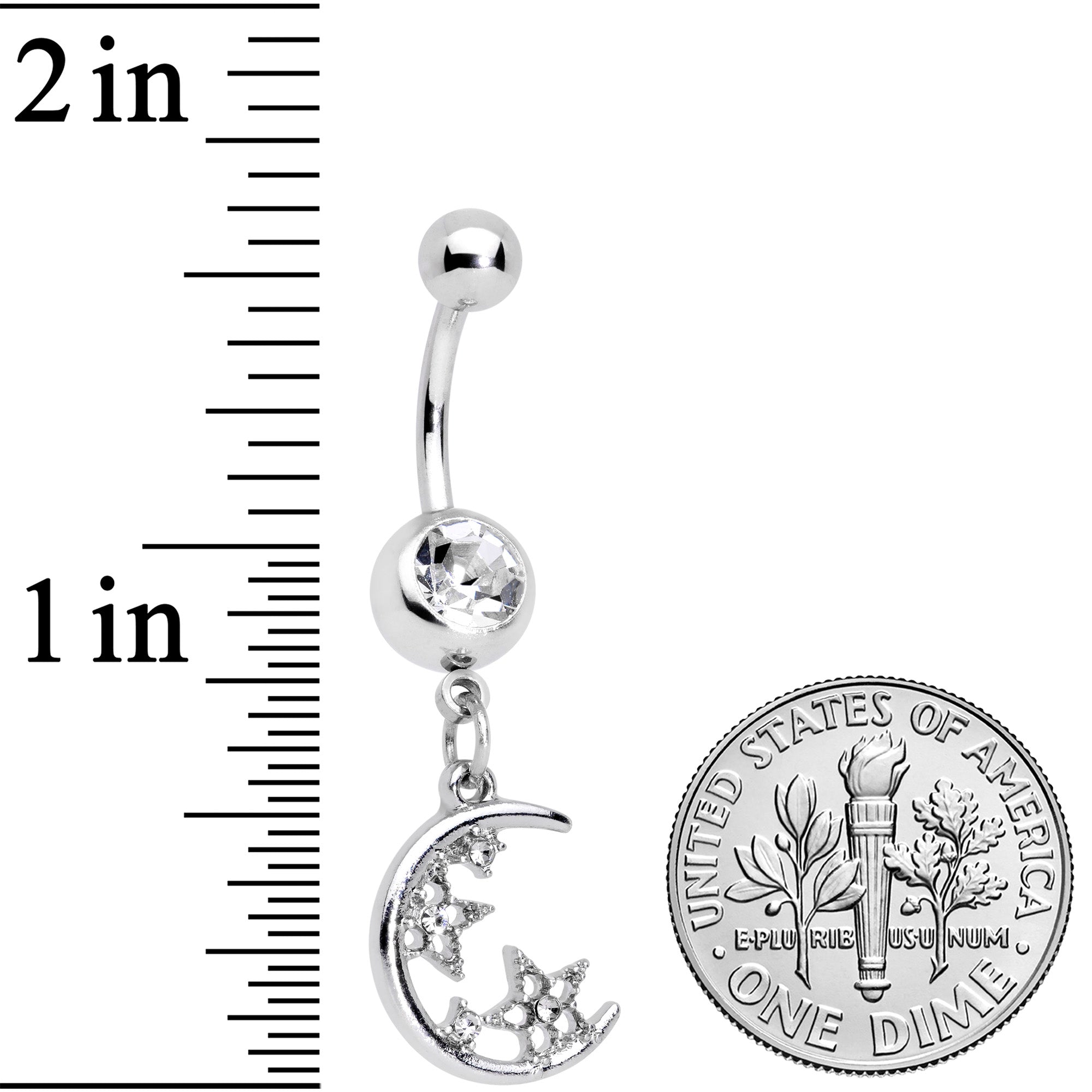 Your navel piercing gets the star treatment -and the moon - with this set of 14 gauge navel rings! You get one 3/8" durable 316L surgical grade stainless steel curved barbell with a 5mm top ball end. The bottom ball end is 8mm and set with a large clear gem. Dangling beneath it is a crescent moon charm, flanked with tiny stars which are set with tiny clear gems. You also get a 3/8" durable 316L surgical grade stainless steel spiral curved barbell with star shaped ends. The stars are set at their centers with clear gems. The third one is made with a 3/8" durable 316L surgical grade stainless steel curved barbell with a 5mm top ball end and an 8mm bottom ball end. The ball ends are made of faceted blue acrylic for a look that's colorful and stylish as well as eye-catching. Get a whole galaxy of different looks with this set of celestial navel jewelry! Sold as a set of three.