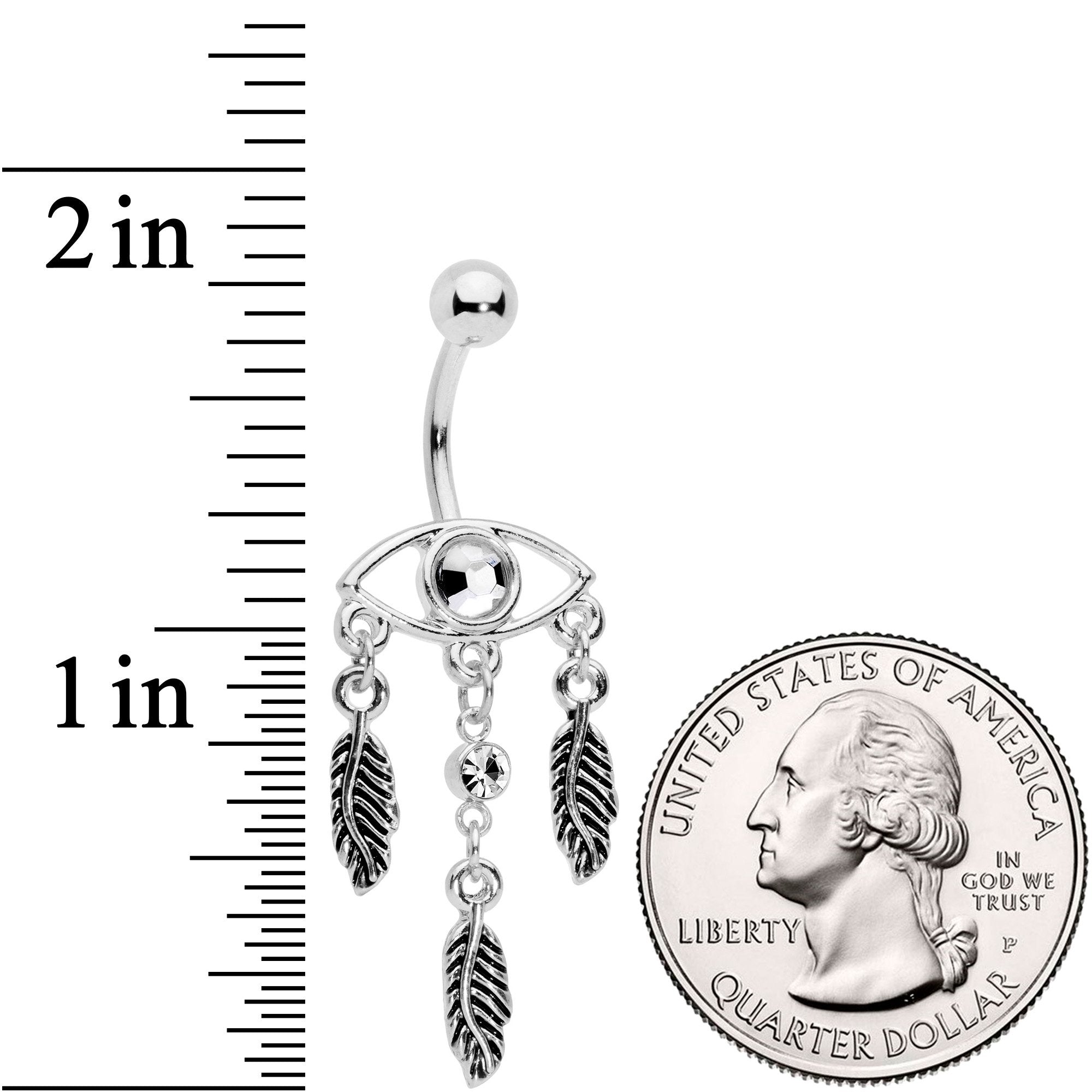 A navel ring this bold is downright visionary! It's 14 gauge and made with a 7/16" durable 316L surgical grade stainless steel curved barbell. At the base is an open eye with a clear gem for its pupil, showing everyone that you clearly see the world around you. But if that weren't enough, there are three feathers dangling from the bottom of the eye, with the center feather embellished with another clear gem. The feathers can sway and shift as you do, allowing you to show off its full effect every time you move. This eye sees the world - now it's time for you to let the world see it on you!