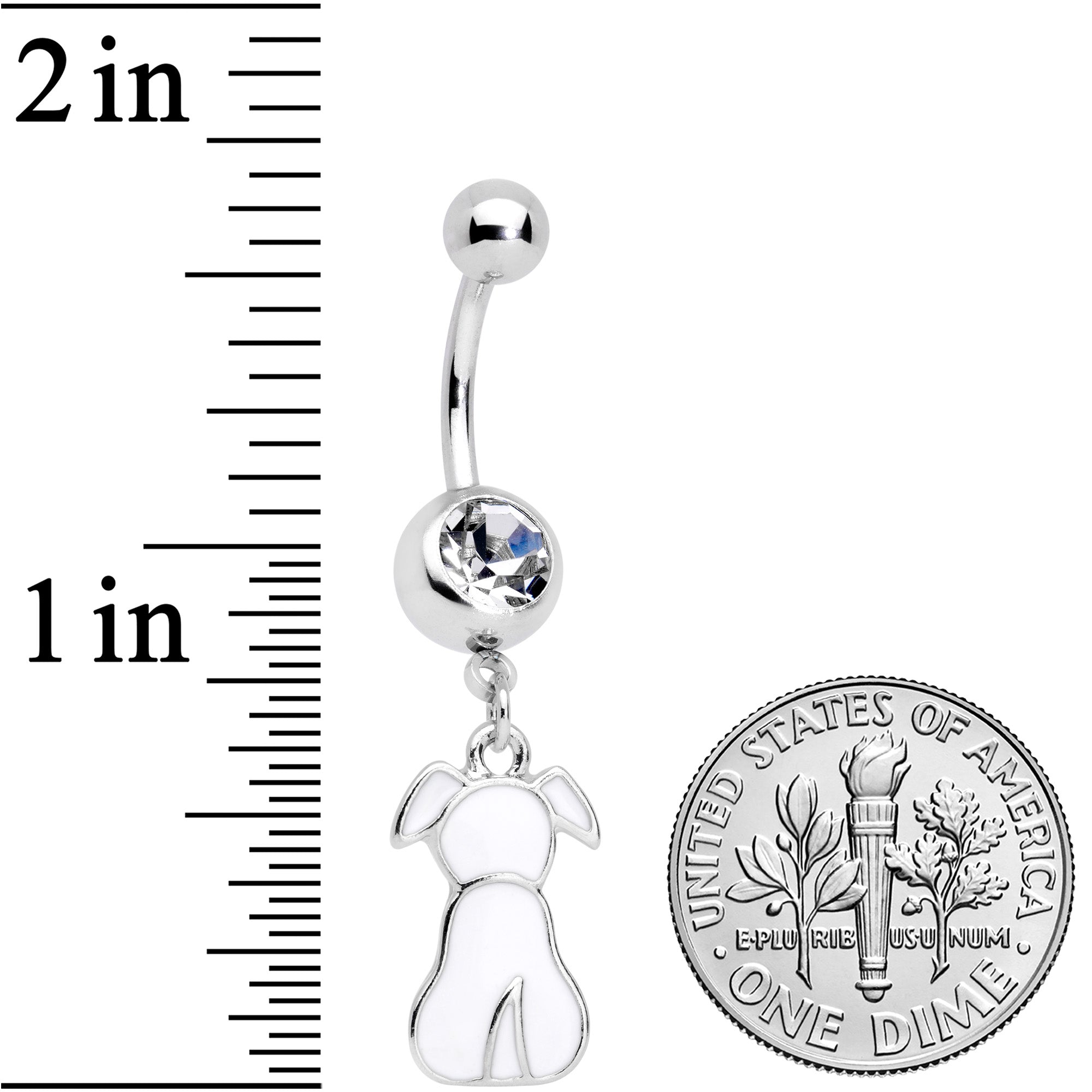 You can tell by perky ears and tail that the dog on this 14 gauge navel ring is a happy pup! It's made with a 3/8" durable 316L surgical grade stainless steel curved barbell with a 5mm top ball end. The bottom ball end is 8mm and set with a large clear gem. Dangling beneath it is a white dog charm, with the dog seen from the back. It has tail and collar detailing and simple-but-sweet styling. If you prefer pooches or are dazzled by dogs, this friendly canine belly button jewelry is sure to make you wag your tail!