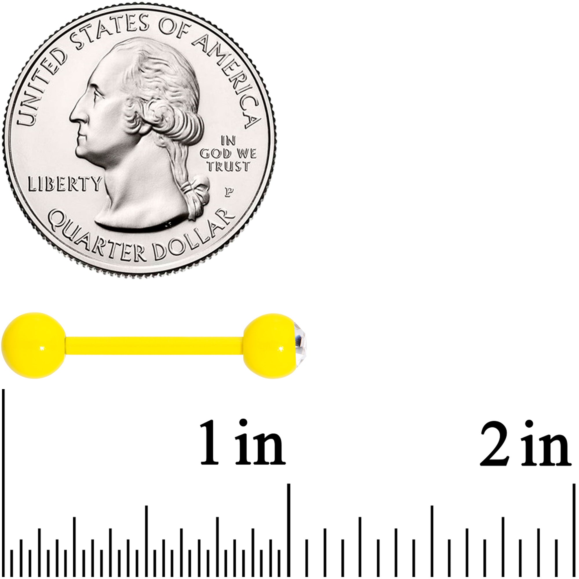 Get into the spirit of summer with this 14 gauge tongue jewelry! It's made with a 5/8" yellow plated over 316L surgical grade stainless steel straight barbell and has 6mm ball ends. The top ball end is set with a large clear gem and if that wasn't eye-catching enough, turn out the lights and this tongue ring glows in the dark! Shed some light on the subject with this eye-catching, glow in the dark tongue barbell!