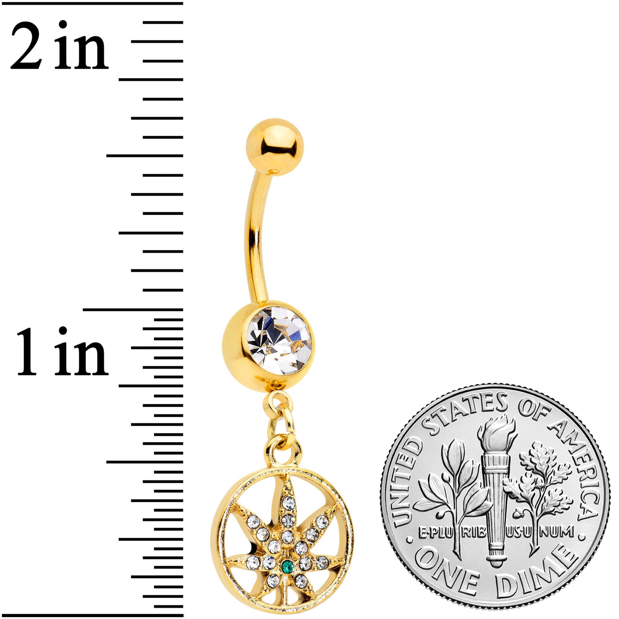 Get your smoke on in style when you're sporting this 14 gauge navel ring! It's made with a 3/8" gold tone PVD over 316L surgical grade stainless steel curved barbell with a 5mm top ball end. The bottom ball end is 8mm and set with a large clear gem. Dangling beneath is a hollow circular charm with a classic marijuana leaf inside it. The pot leaf is set with clear gems along the points and has an appropriately green gem set at the center. This perfect pot leaf belly button jewelry is sure to have you feeling a buzz!