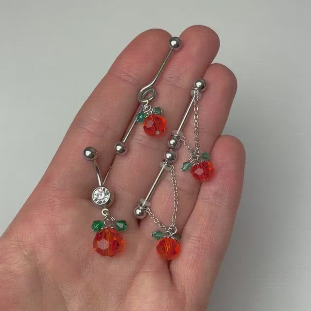 Pick the best pumpkin in the patch with this 14 gauge navel ring! It's made with a 3/8" durable 316L surgical grade stainless steel curved barbell with a 5mm top ball end. The bottom ball end is 8mm and set with a large clear gem. Dangling beneath it is a pumpkin charm, composed of a large orange gem. The pumpkin also features green gem leaves for a colorful and realistic look. Pick a winning Halloween-themed belly button ring with this perfect pumpkin navel piercing jewelry!