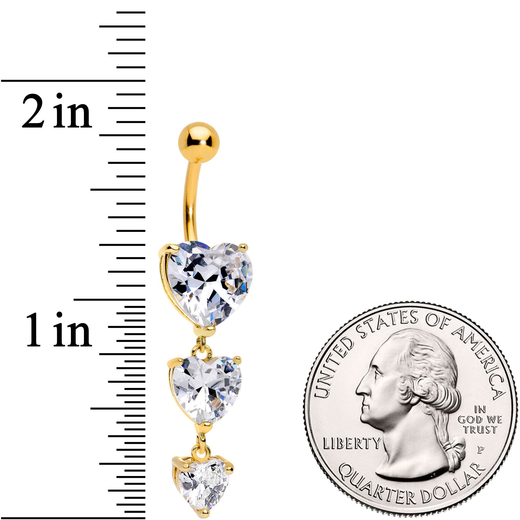 This 14 gauge navel ring isn't for the faint of heart! Featuring three strikingly bold clear cubic zirconia gems in heart shapes, it is guaranteed to catch the light and catch the eye as they hang and sway. This 11mm belly button ring is made with a gold tone anodized over durable 316L surgical grade stainless steel curved barbell for longevity while completing the look of luxurious glamour. If you're the kind of person that has a big heart, this is the belly ring you've been waiting for!